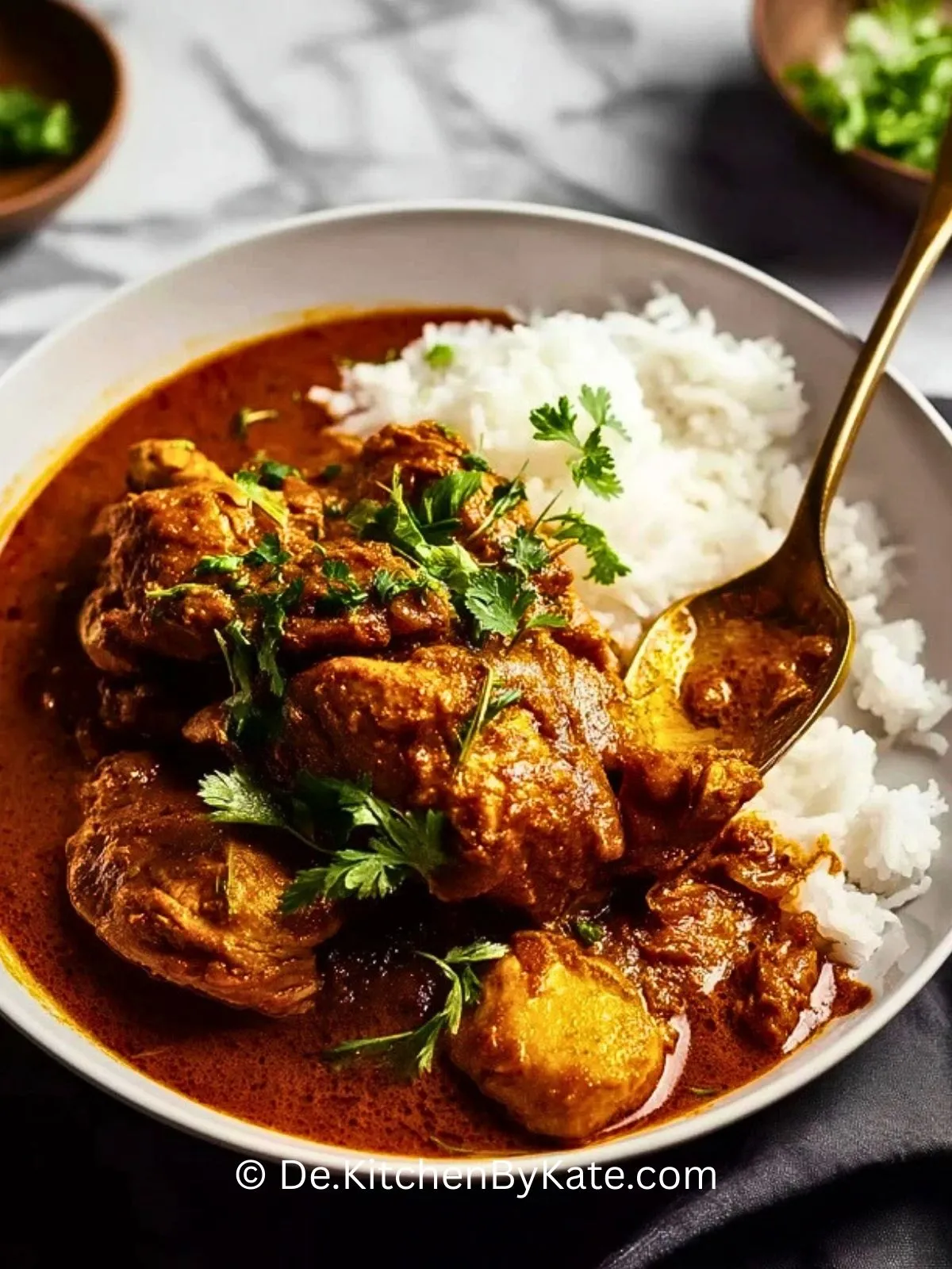 Afrikanisches Hühnchen-Curry ist ein wunderbar aromatisches Wohlfühlgericht, bei dem zartes Hähnchen in einer cremigen Sauce aus Kokosmilch, Tomaten und Erdnussbutter schmort. Wärmende Gewürze wie Curry, Kreuzkümmel und Zimt sorgen für Tiefe, während frische Kräuter und Limette dem Ganzen einen belebenden Frischekick verleihen.