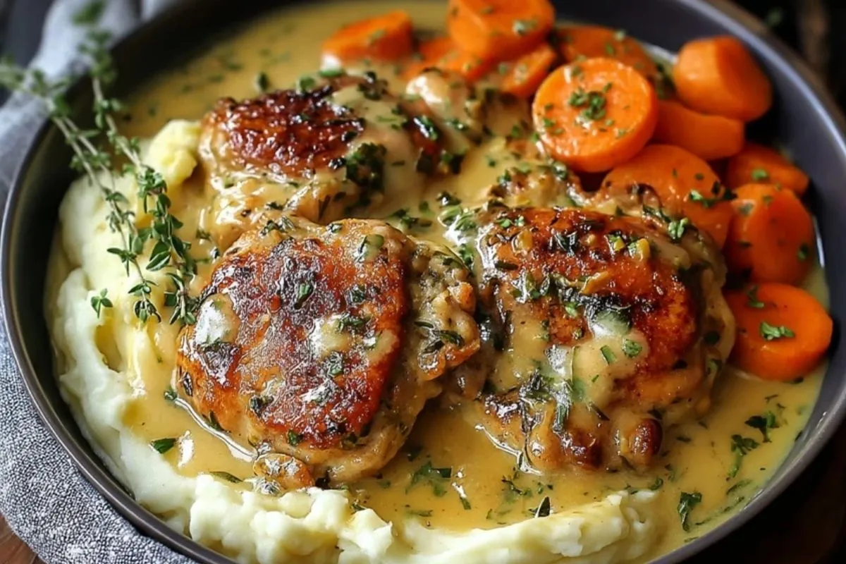 Cremige Kräuterhähnchenschenkel mit Karotten und Kartoffelpüree