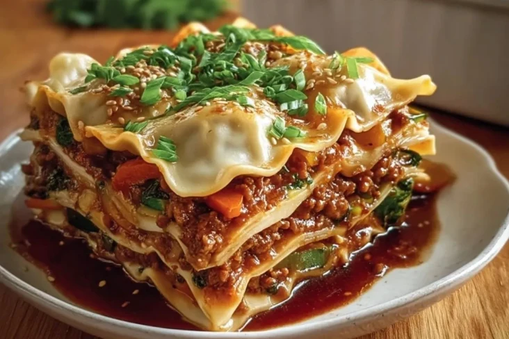 Eine herzhafte Asiatische Teigtaschen-Lasagne ist die perfekte Mischung aus saftigen Schichten, würziger Füllung und gemütlichem Ofengericht-Charakter. Sie verbindet zarte Teiglagen mit aromatischem Hackfleisch, Gemüse, Sojasauce, Ingwer und geschmolzenem Käse zu einem besonderen Rezept, das vertraut und zugleich überraschend schmeckt.