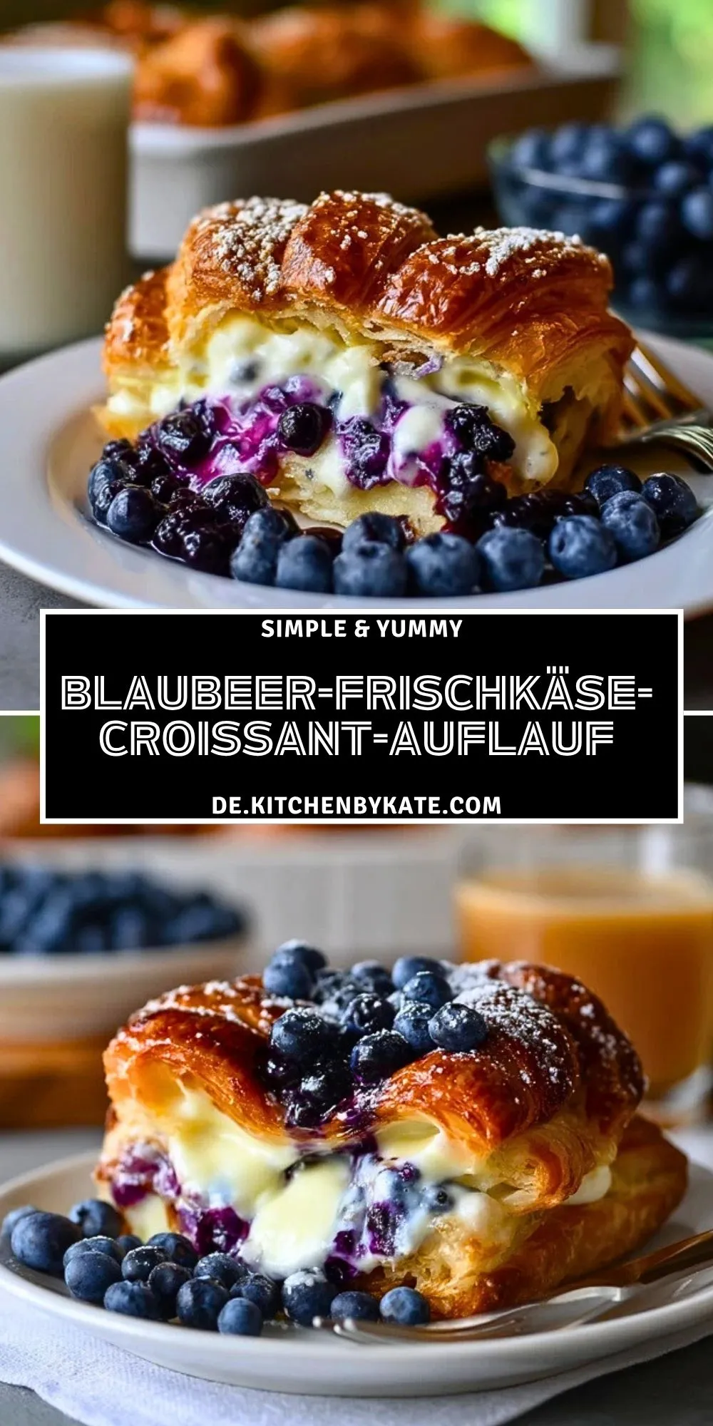 Keywords: Blaubeer-Frischkäse-Croissant-Auflauf, Croissant-Auflauf, Brunch Rezept, süßer Auflauf, Blaubeer Dessert