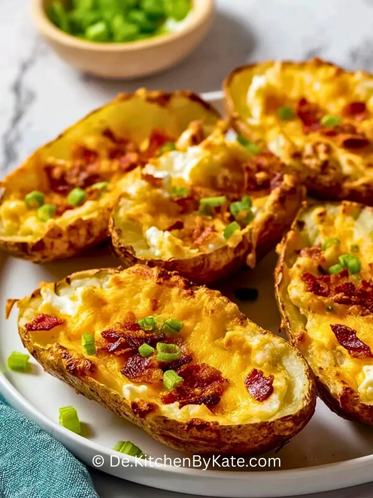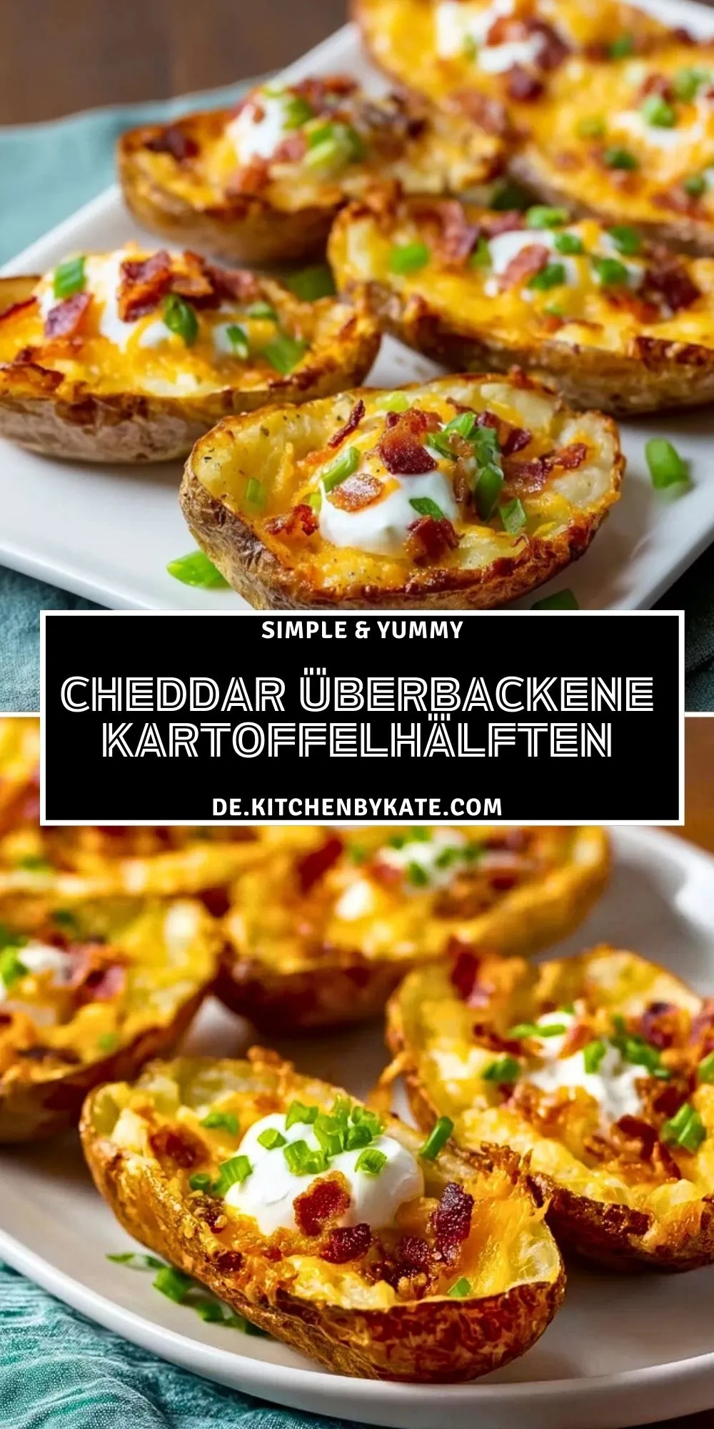 Cheddar Überbackene Kartoffelhälften sind außen knusprig, innen cremig und voller herzhaftem Geschmack. Geschmolzener Cheddar, krosser Speck und frische Frühlingszwiebeln machen sie zu einem einfachen Ofengericht, das als Snack, Beilage oder unkompliziertes Hauptgericht immer gut ankommt.