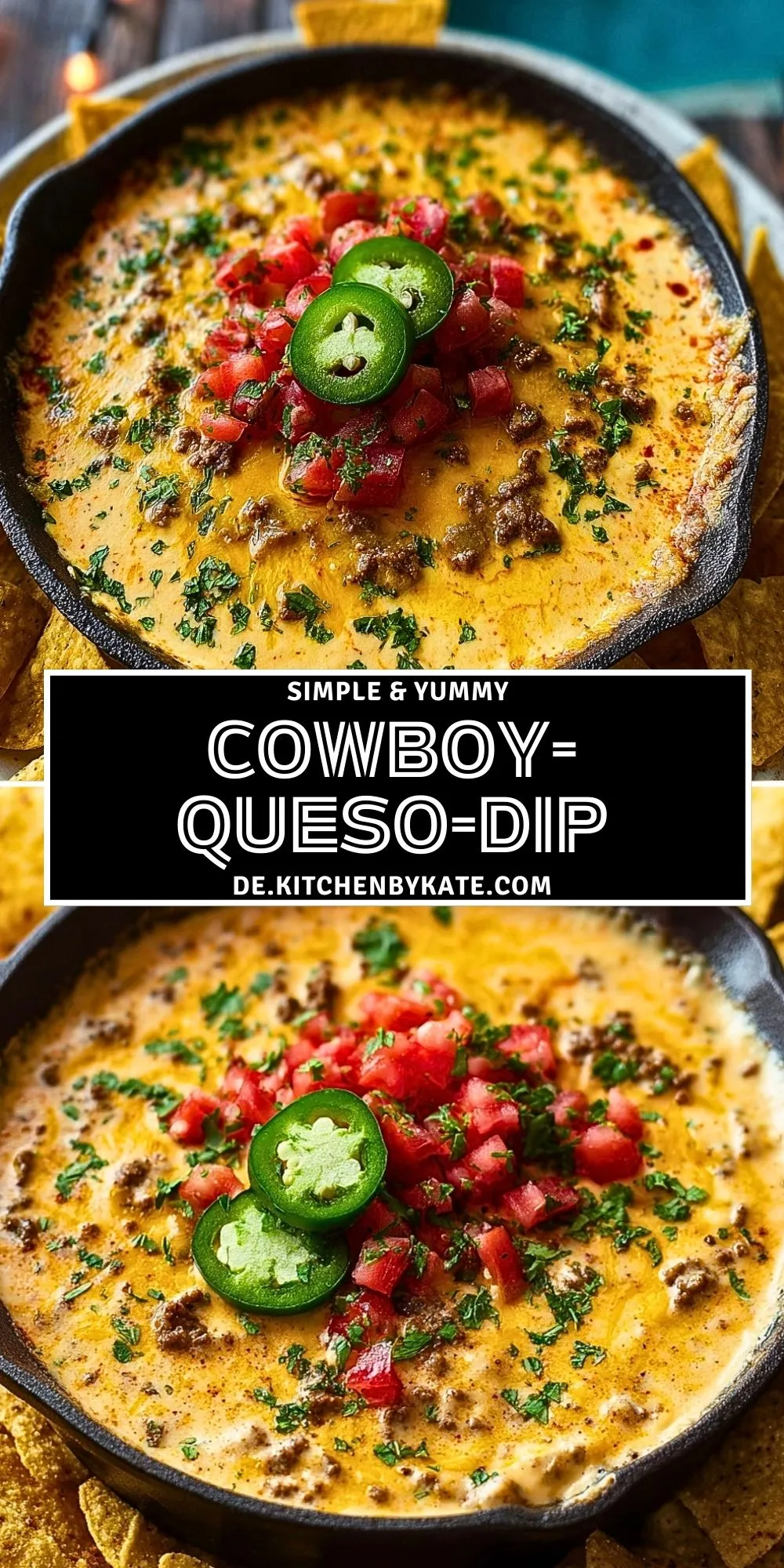 Cremiger Cowboy Queso Dip vereint geschmolzenen Cheddar, würziges Hackfleisch, Tomaten und Jalapeños zu einem unwiderstehlichen Tex-Mex-Dip. Perfekt für Partys, Filmabende oder als herzhafter Snack – einfach mit Tortilla-Chips genießen!