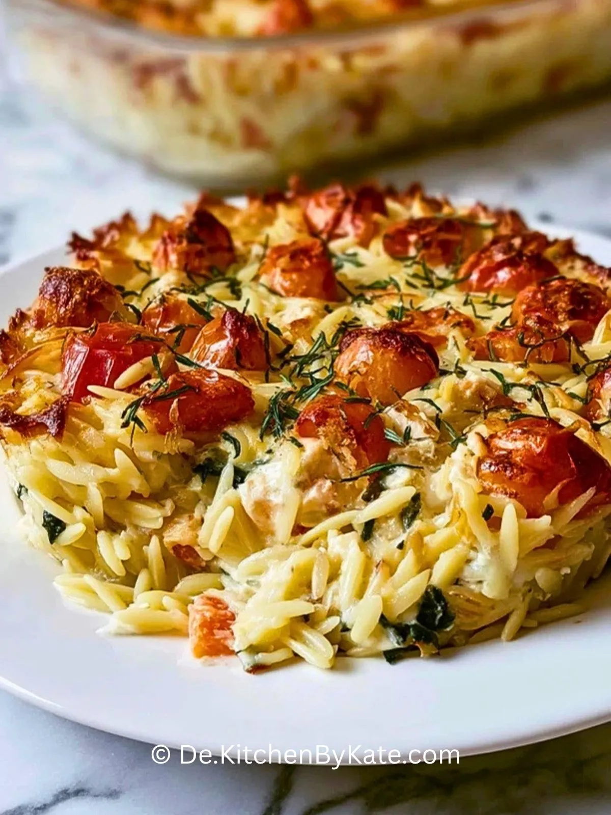 Nimm den Auflauf aus dem Ofen und lasse ihn 5 Minuten ruhen. Dadurch setzt sich die Sauce etwas, der Orzo nimmt noch ein wenig Flüssigkeit auf und das Gericht lässt sich besser portionieren.