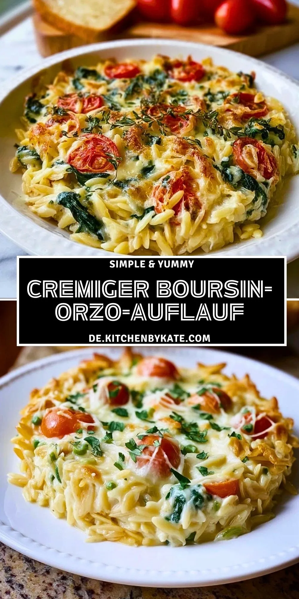Keywords: Boursin-Orzo-Auflauf, Orzo-Auflauf, cremiger Nudelauflauf, Auflauf mit Tomaten, vegetarischer Auflauf