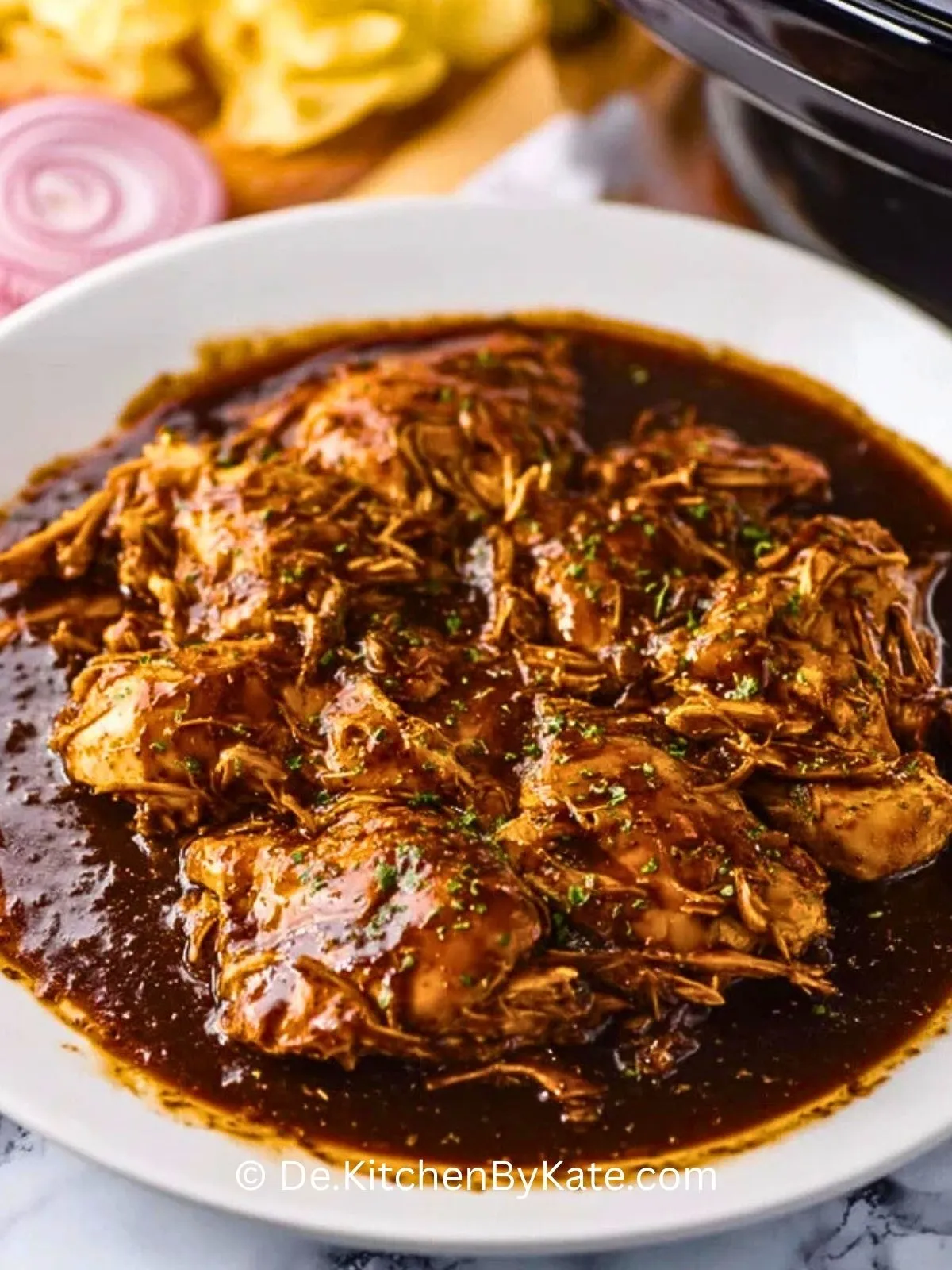 Besonders praktisch: Du kannst alles morgens in den Slow Cooker geben und abends ohne Stress servieren. Das Hähnchen lässt sich ganz leicht auseinanderzupfen und bleibt dabei unglaublich saftig – ideal für Familienessen, Partys oder wenn du Gäste entspannt beeindrucken möchtest.
