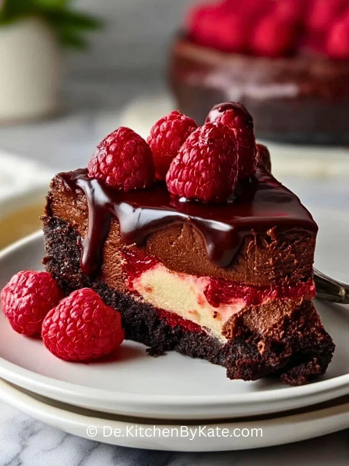 Dunkler Schokoladen-Himbeer-Käsekuchen vereint einen knusprigen Schoko-Keksboden, eine cremige Schokokäse-Füllung mit fruchtigen Himbeeren und eine glänzende Ganache zu einem luxuriösen Dessert, das perfekt für besondere Anlässe oder gemütliche Kaffeerunden ist.