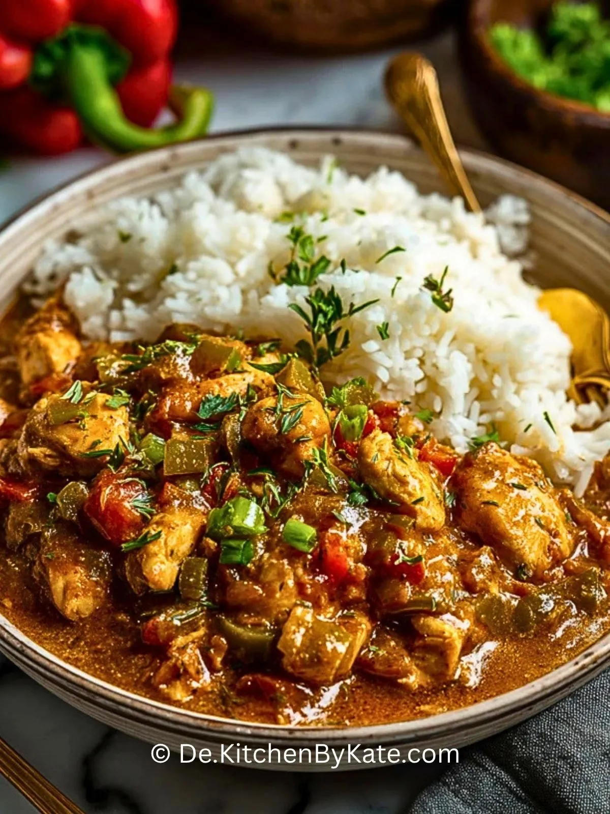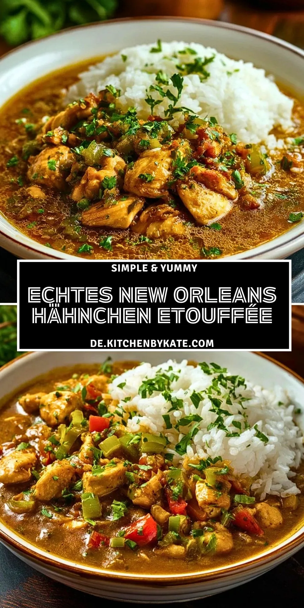 Keywords: Hähnchen Etouffée, New Orleans Hähnchen, Cajun Rezept, kreolisches Hähnchen, Hähnchen mit Reis