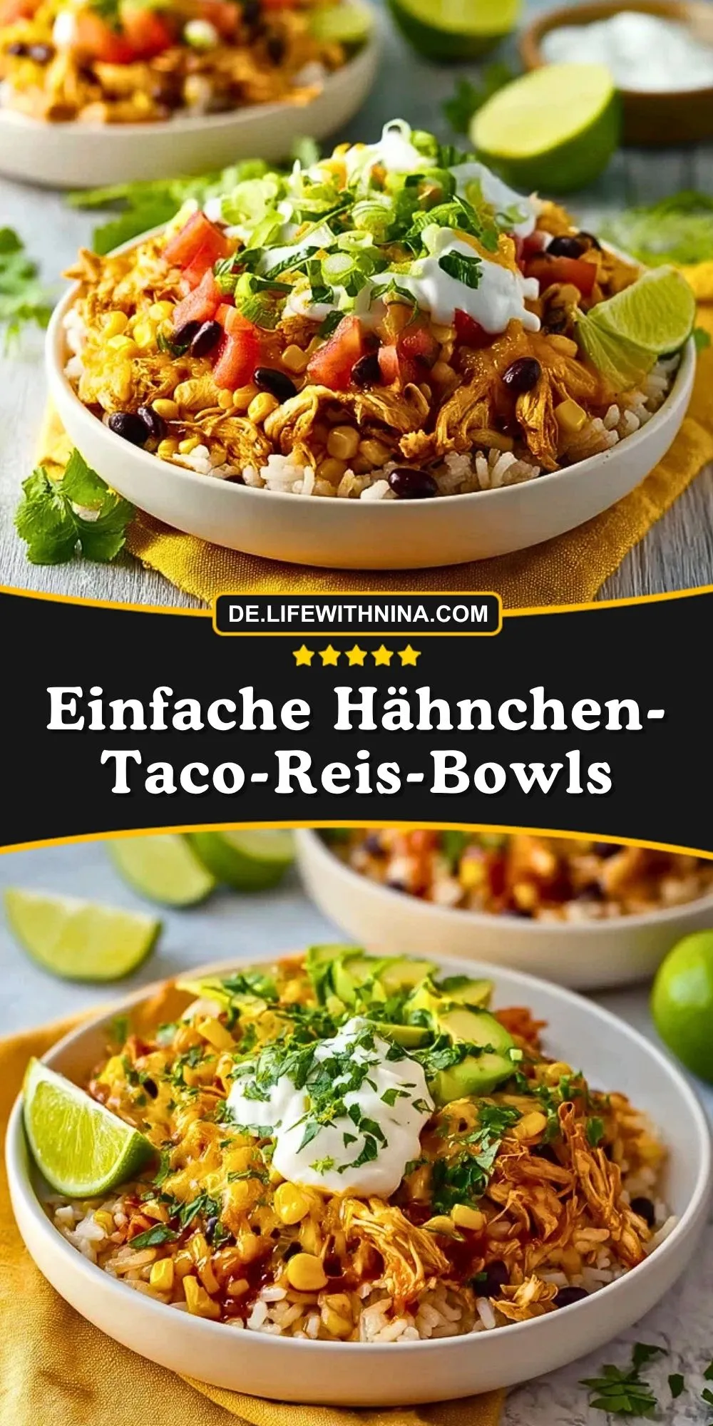 Keywords: Hähnchen-Taco-Reis-Bowls, Hähnchen Bowl, Reis Bowl, schnelles Abendessen, Tex-Mex Rezept
