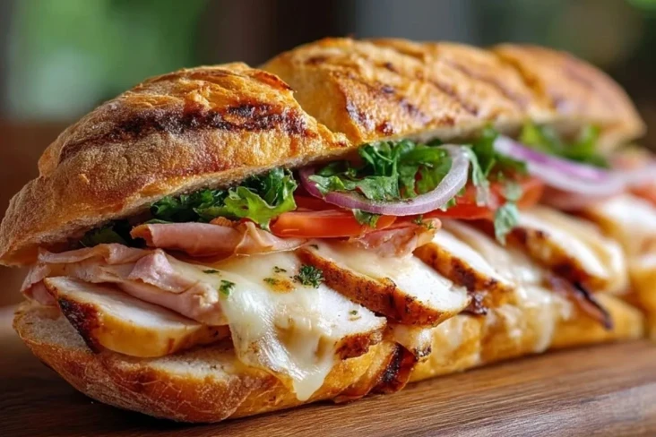 Ein warmes Sandwich mit gegrilltem Hähnchen, würzigem Schinken und geschmolzenem Emmentaler, serviert auf knusprigem Baguette mit frischem Salat, Tomate und einer cremigen Senf-Mayonnaise. Perfekt für das schnelle Mittagessen, als Snack oder für unterwegs.