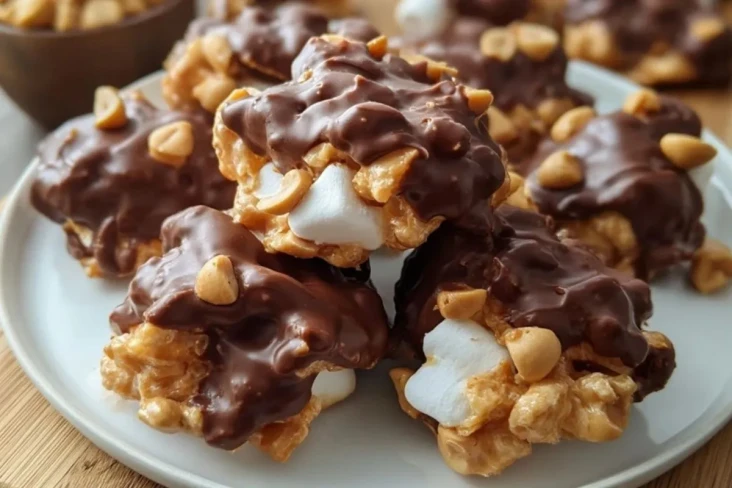 Diese Erdnuss-Marshmallow-Häufchen sind schnell gemacht und verbinden knackige Erdnüsse, knusprige Cornflakes, weiche Marshmallows und eine cremige Schokoladen-Erdnussbutter-Mischung zu einem unkomplizierten No-Bake-Snack, der sich perfekt für Partys, Feiertage oder als süßer Happen zum Kaffee eignet.