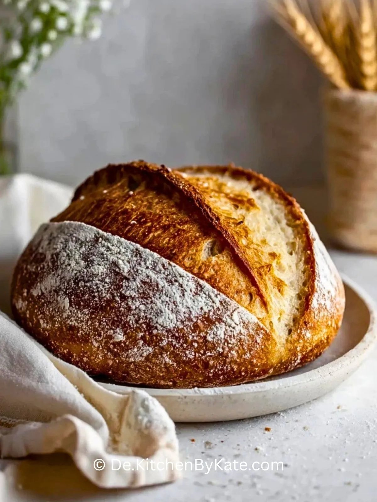 Heize den Ofen mit einem gusseisernen Topf (oder Backstein) auf 250 °C vor. Stürze den Teig vorsichtig auf Backpapier, ritze die Oberfläche ein und gib ihn in den heißen Topf. Backe 20 Minuten mit Deckel, dann weitere 25 Minuten ohne Deckel bei 220 °C, bis die Kruste goldbraun und knusprig ist.