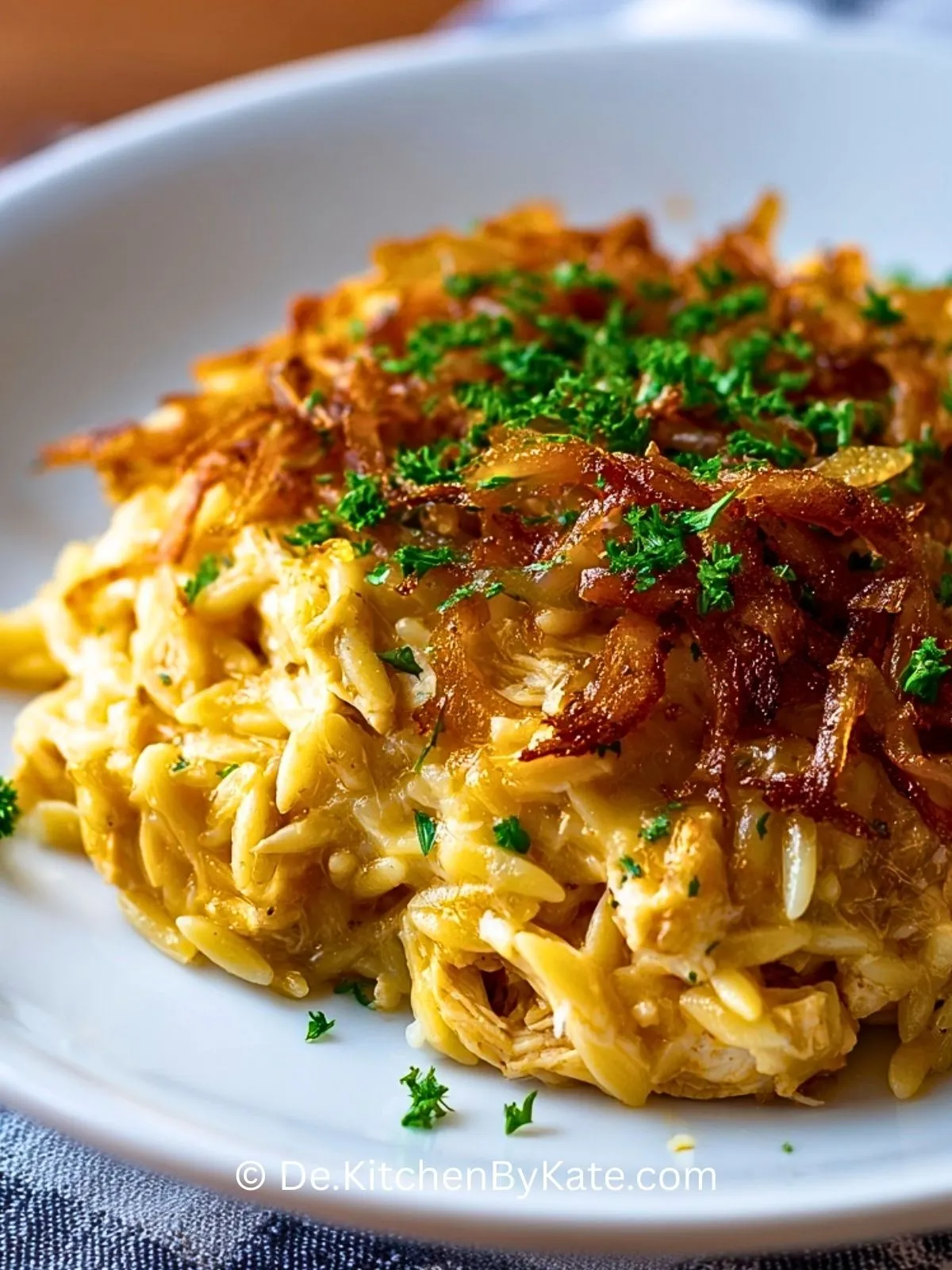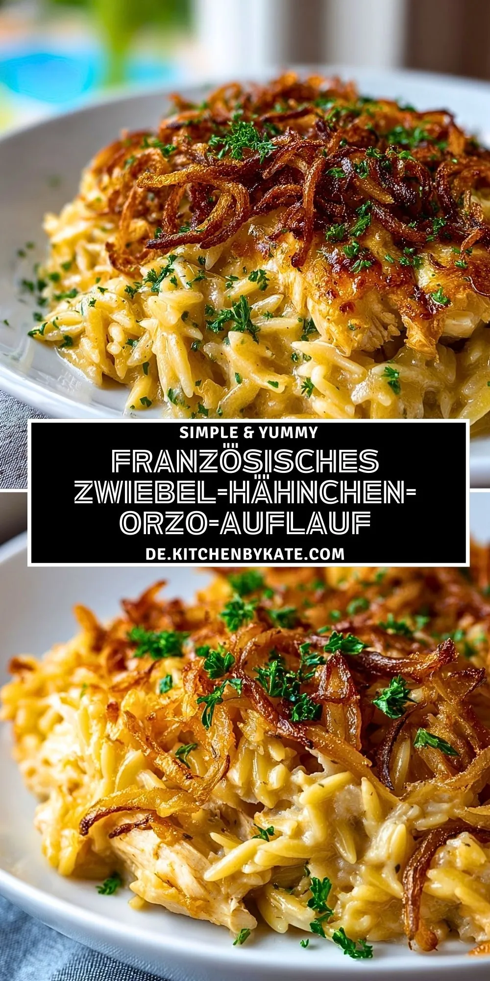 Französischer Zwiebel-Hähnchen-Orzo-Auflauf