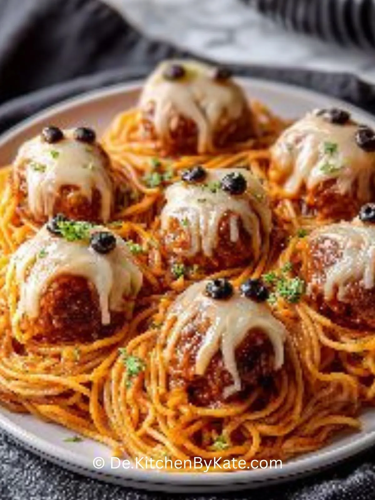 Diese gespenstischen Spaghetti mit Käse-Monsterfleischbällchen sind ein herzhaftes Halloween-Pastagericht mit saftigen Hackfleischbällchen, würziger Tomatensoße, schmelzendem Mozzarella und schwarzen Olivenaugen. Das Rezept ist familienfreundlich, einfach vorzubereiten und perfekt, wenn ein klassisches Abendessen mit einem gruseligen Twist serviert werden soll.