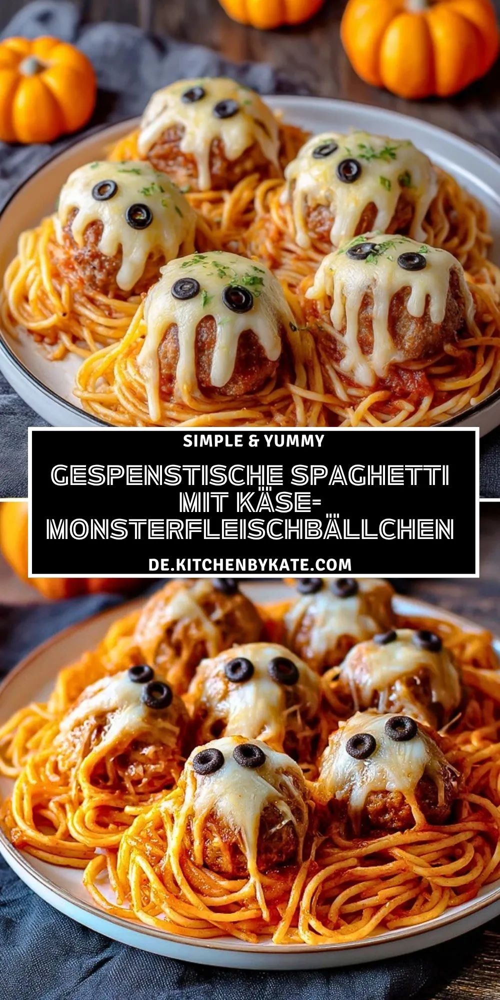 Gespenstische Spaghetti mit Käse-Monsterfleischbällchen