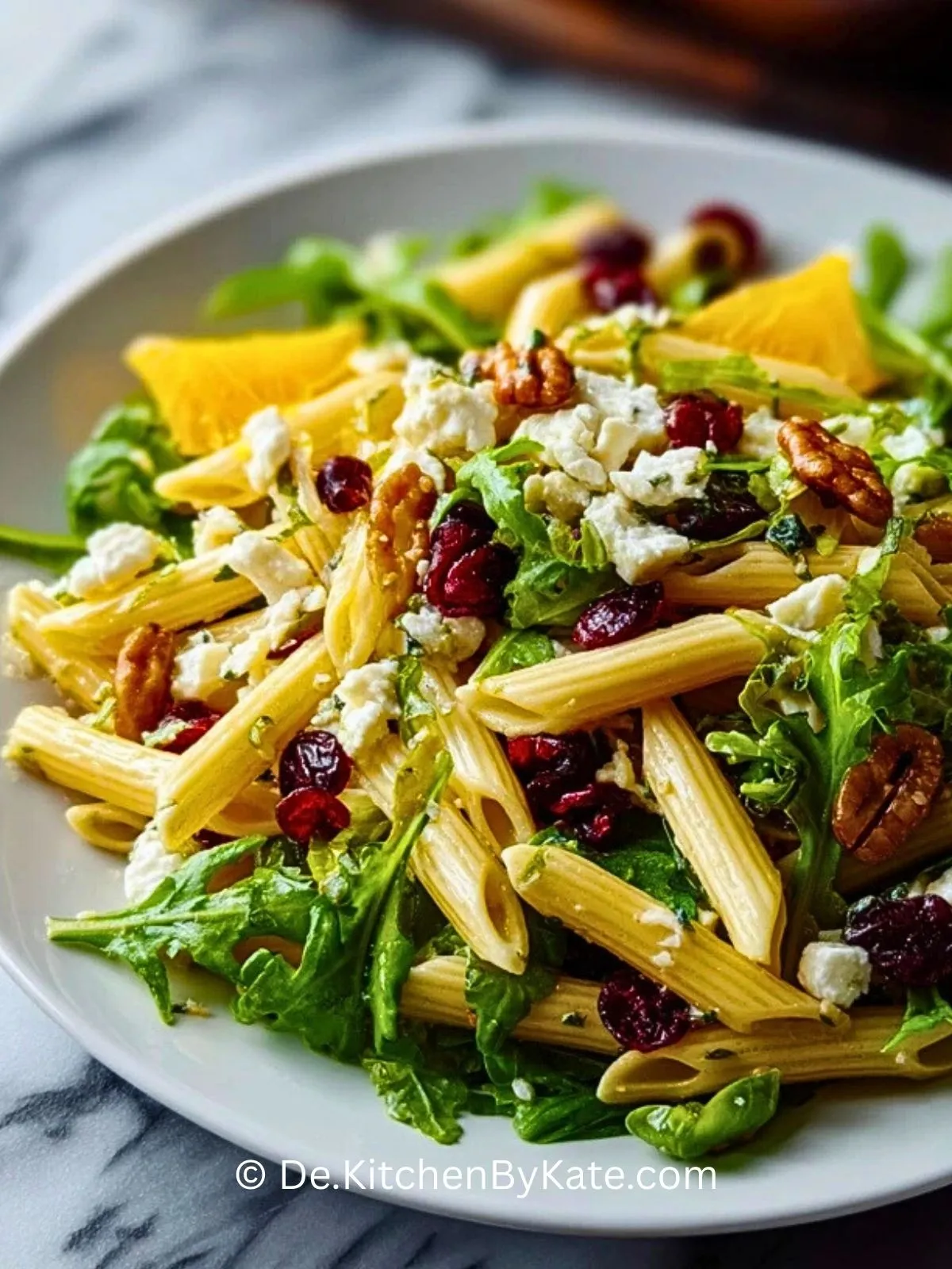 Gesunder Penne-Salat mit Feta, Cranberries und Orangen-Vinaigrette