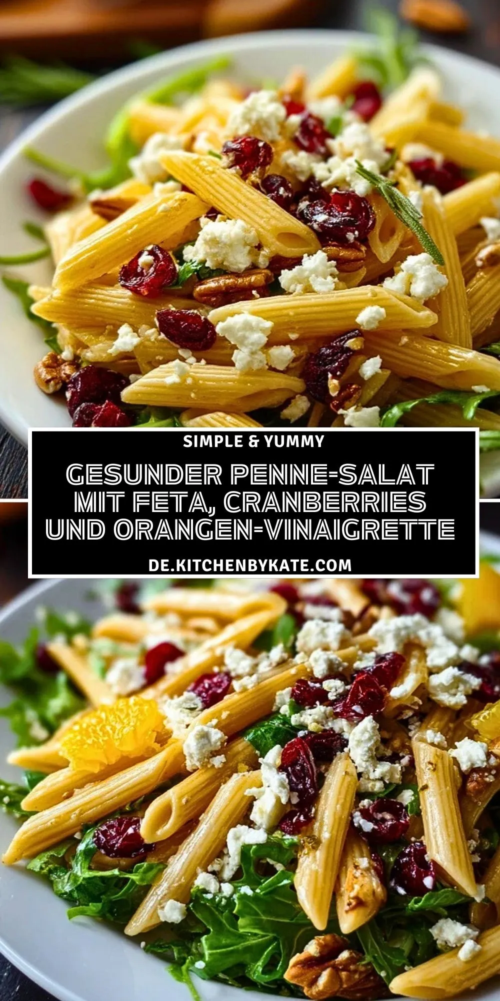 Ein leichter, gesunder Penne-Salat mit würzigem Feta, süßen Cranberries, knackigen Walnüssen und einer fruchtig-frischen Orangen-Vinaigrette. Perfekt für heiße Tage, als Meal Prep oder als bunte Beilage.