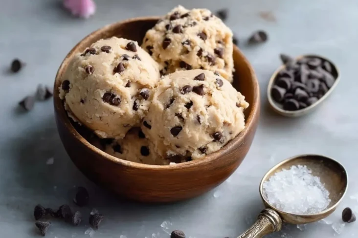 Am besten schmeckt glutenfreier Hüttenkäse-Keksteig gut gekühlt. Du kannst ihn in kleinen Schälchen servieren, mit zusätzlichen Schokotropfen garnieren oder mit etwas grobem Meersalz bestreuen, wenn du den süß-salzigen Kontrast magst. Auch als schnelles Dessert nach dem Essen oder als kleine Nascherei aus dem Kühlschrank funktioniert er wunderbar.