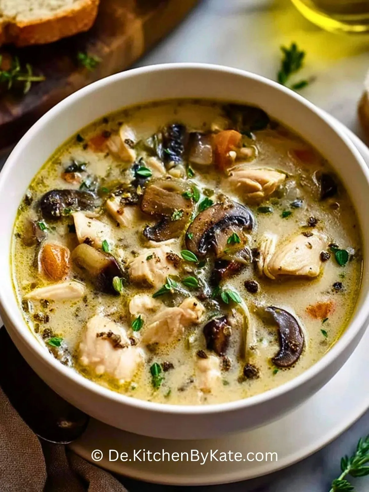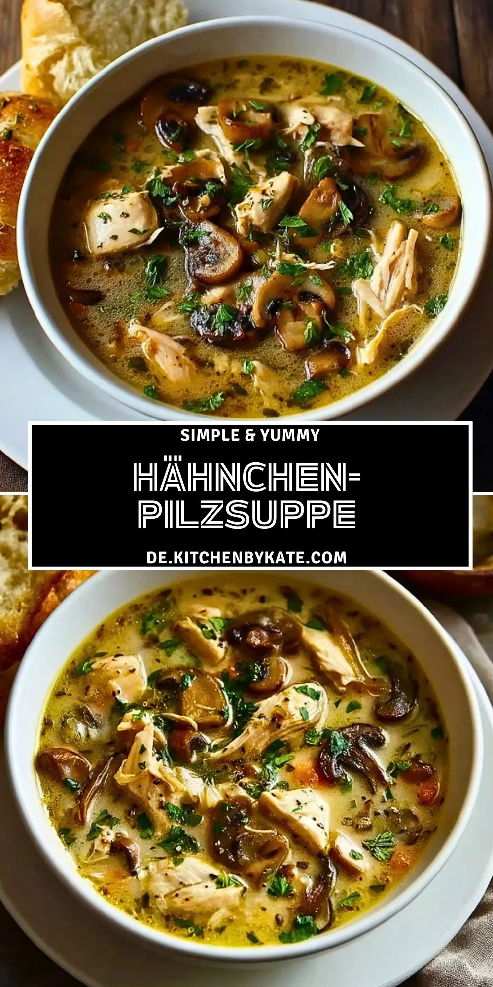 Diese Hähnchen-Pilzsuppe ist cremig, herzhaft und voller aromatischer Pilze. Zartes Hähnchenfleisch, braune Champignons, Gemüse, Kräuter und Sahne ergeben eine wärmende Suppe, die sich wunderbar als Familienessen oder gemütliche Mahlzeit an kühlen Tagen eignet.