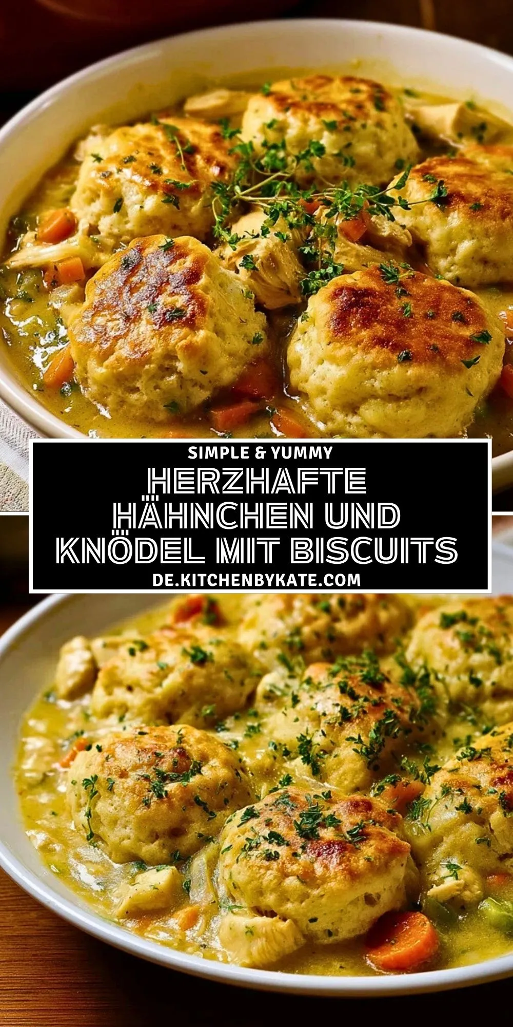 Dieses Gericht ist pures Wohlfühlessen: zartes Hähnchen in einer cremigen, würzigen Sauce, dazu weiches Gemüse und goldbraun gebackene Biscuits, die beim Servieren wunderbar die Sauce aufsaugen. Herzhafte Hähnchen und Knödel mit Biscuits verbinden den Charakter eines klassischen Eintopfs mit dem Genuss frisch gebackener Teigstücke – sättigend, wärmend und genau richtig für Tage, an denen es etwas besonders Gemütliches sein darf.