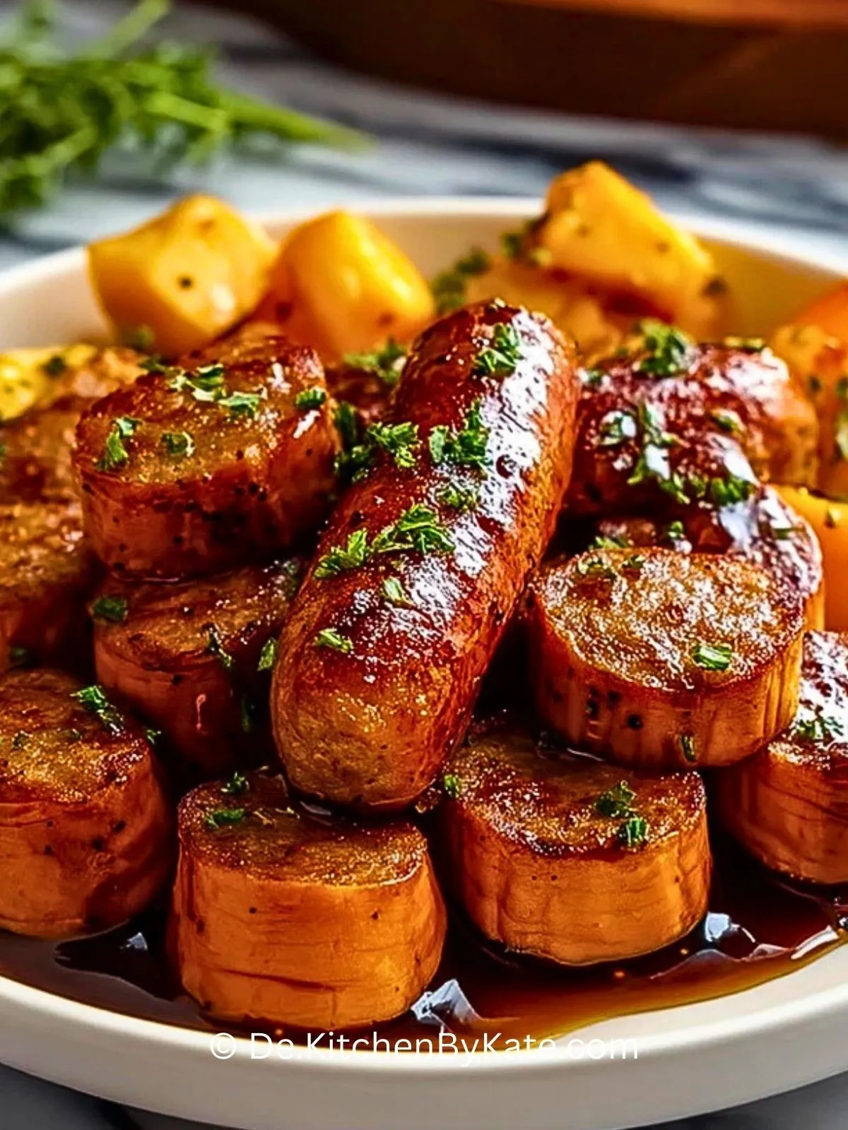 So bereitest du Honig-Knoblauch-Wurst mit Süßkartoffeln zu