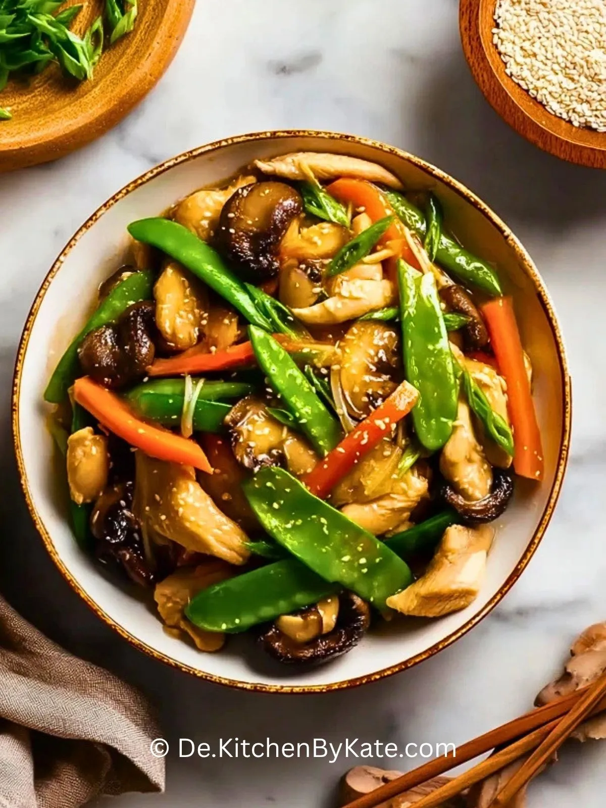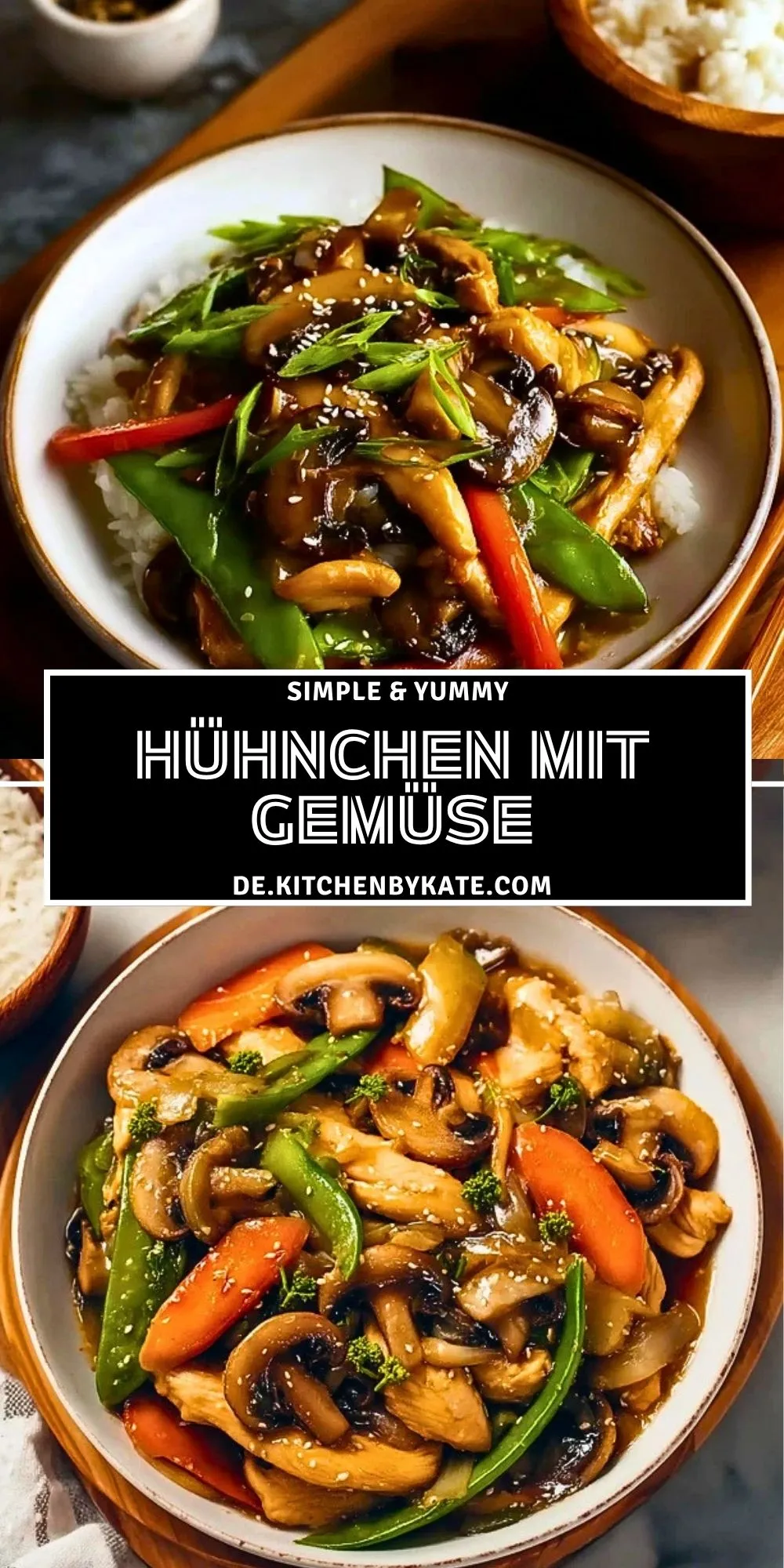 Hühnchen mit Gemüse ist ein schnelles, ausgewogenes Pfannengericht mit zartem Hähnchenfleisch, knackigen Zuckerschoten, Champignons, Möhren und Erbsen in einer würzigen Sauce. Das Rezept eignet sich ideal für den Alltag, schmeckt mit Reis oder Nudeln und lässt sich wunderbar vorbereiten.