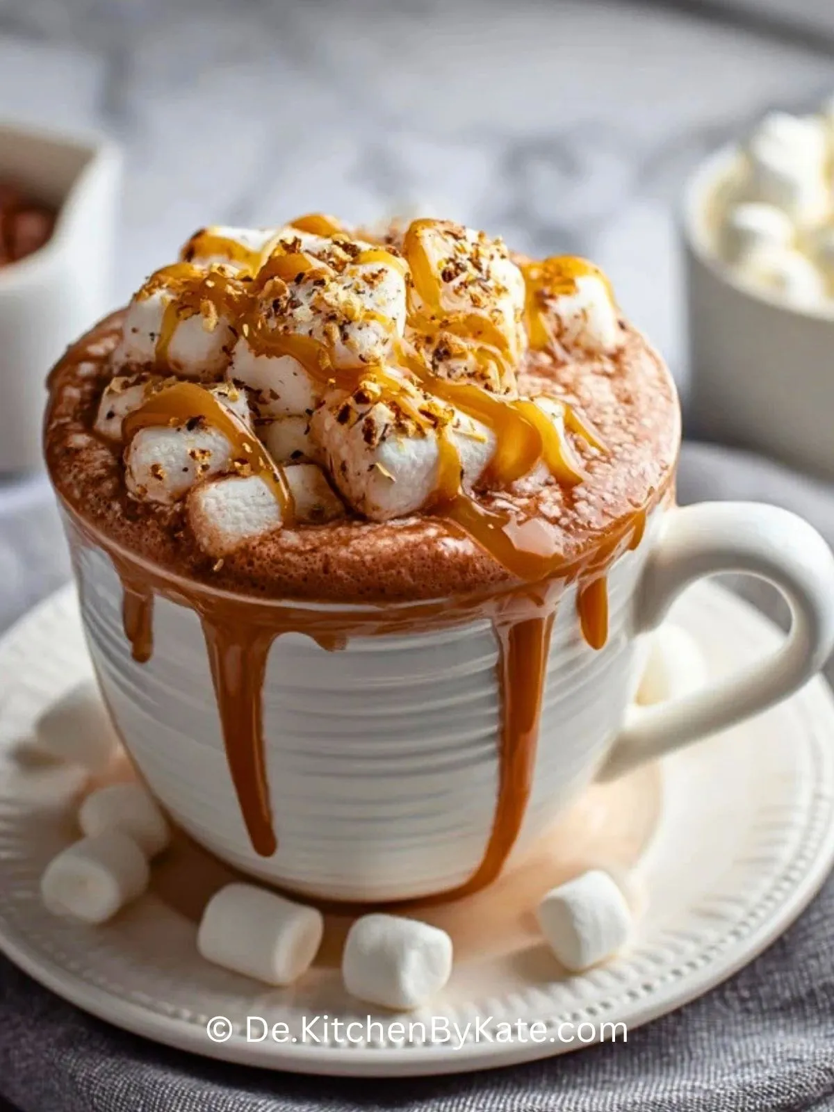 Gib großzügig Mini-Marshmallows auf die heiße Schokolade. Nach Wunsch zusätzlich etwas Schlagsahne daraufsetzen und alles mit extra Karamellsauce beträufeln.