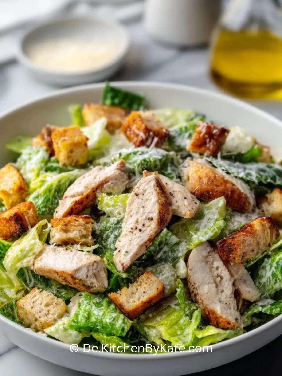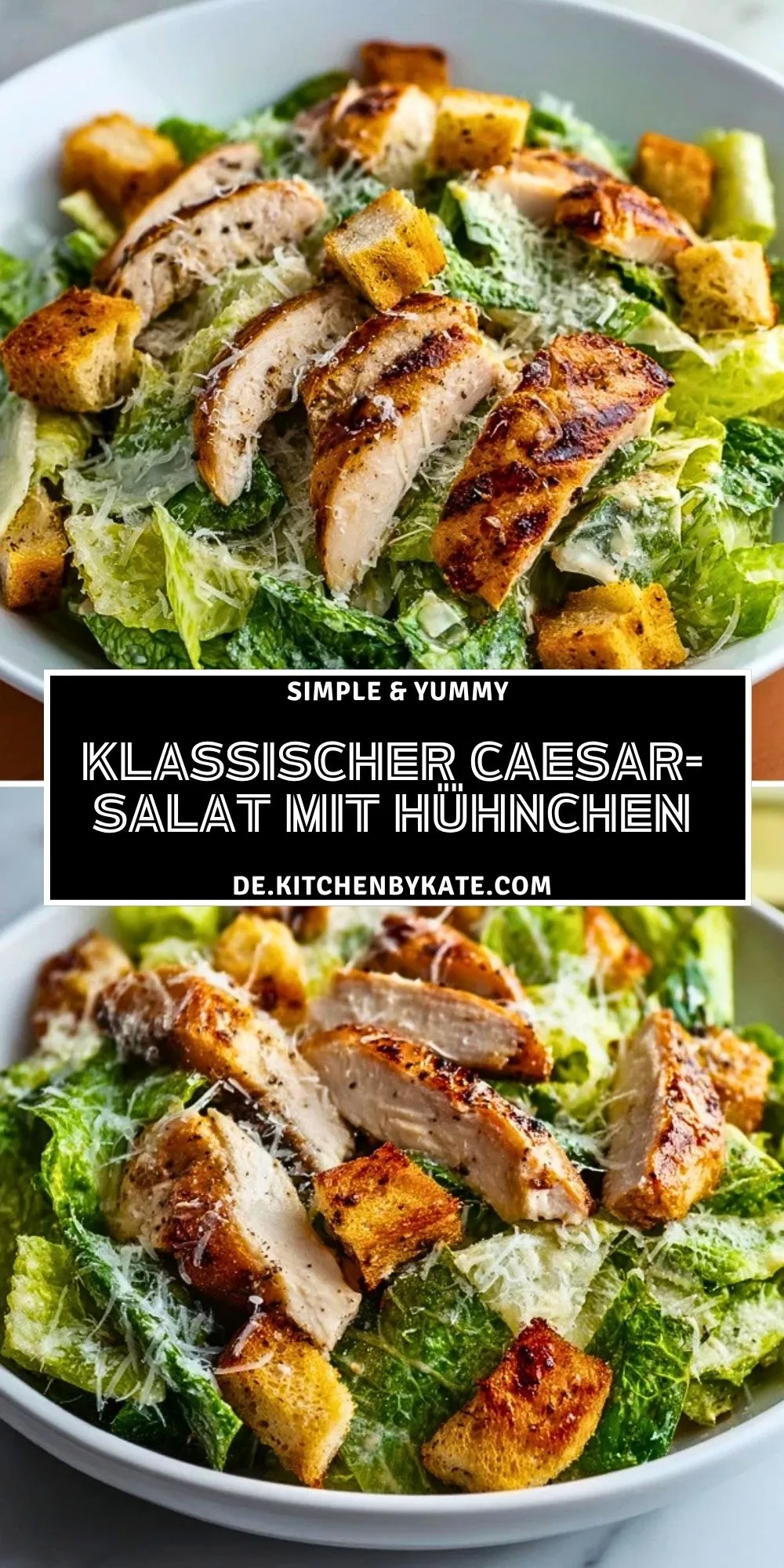Ein klassischer Caesar-Salat mit Hühnchen ist frisch, herzhaft und wunderbar ausgewogen. Knackiger Römersalat, saftiges gebratenes Hähnchen, knusprige Croûtons, Parmesan und ein cremiges Dressing machen ihn zu einem beliebten Gericht für Mittag- oder Abendessen.