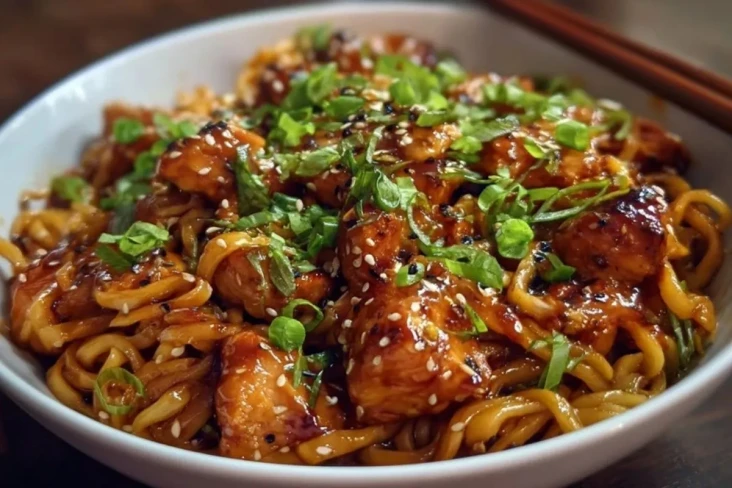 Klebrige Knoblauch-Hühnchen-Nudeln