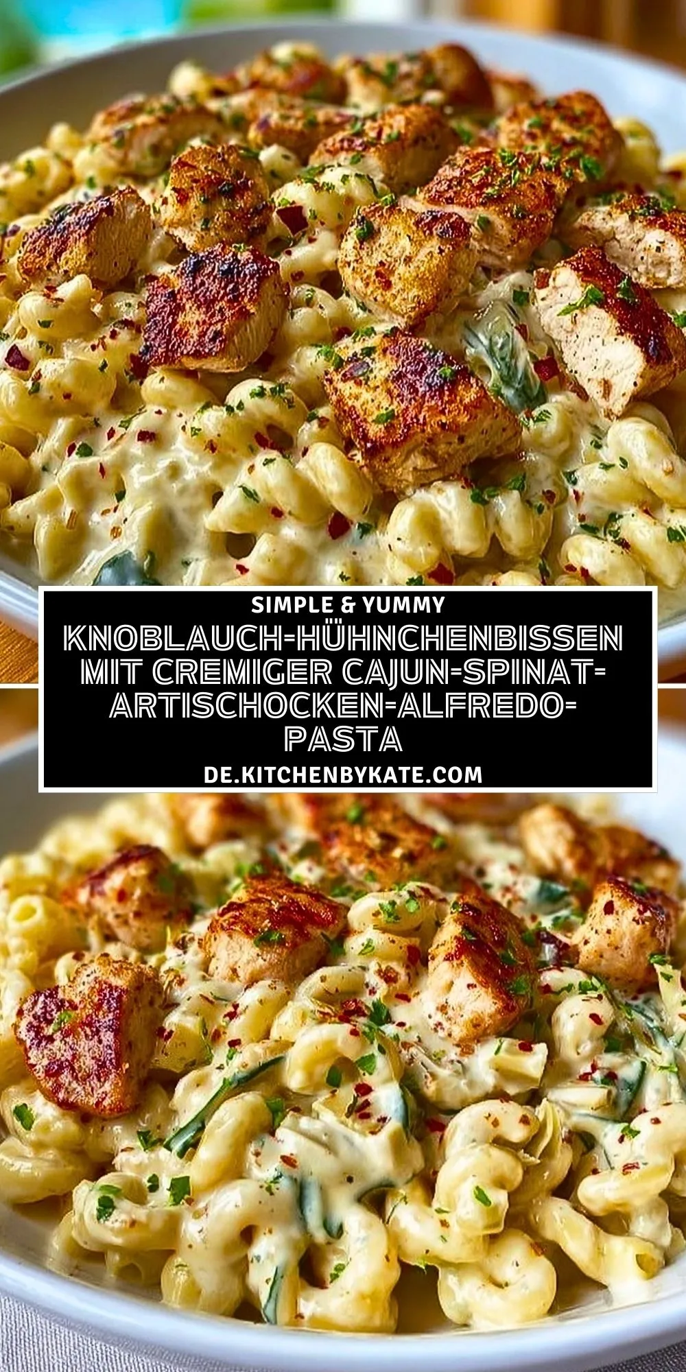 Knoblauch-Hühnchenbissen mit cremiger Cajun-Spinat-Artischocken-Alfredo-Pasta