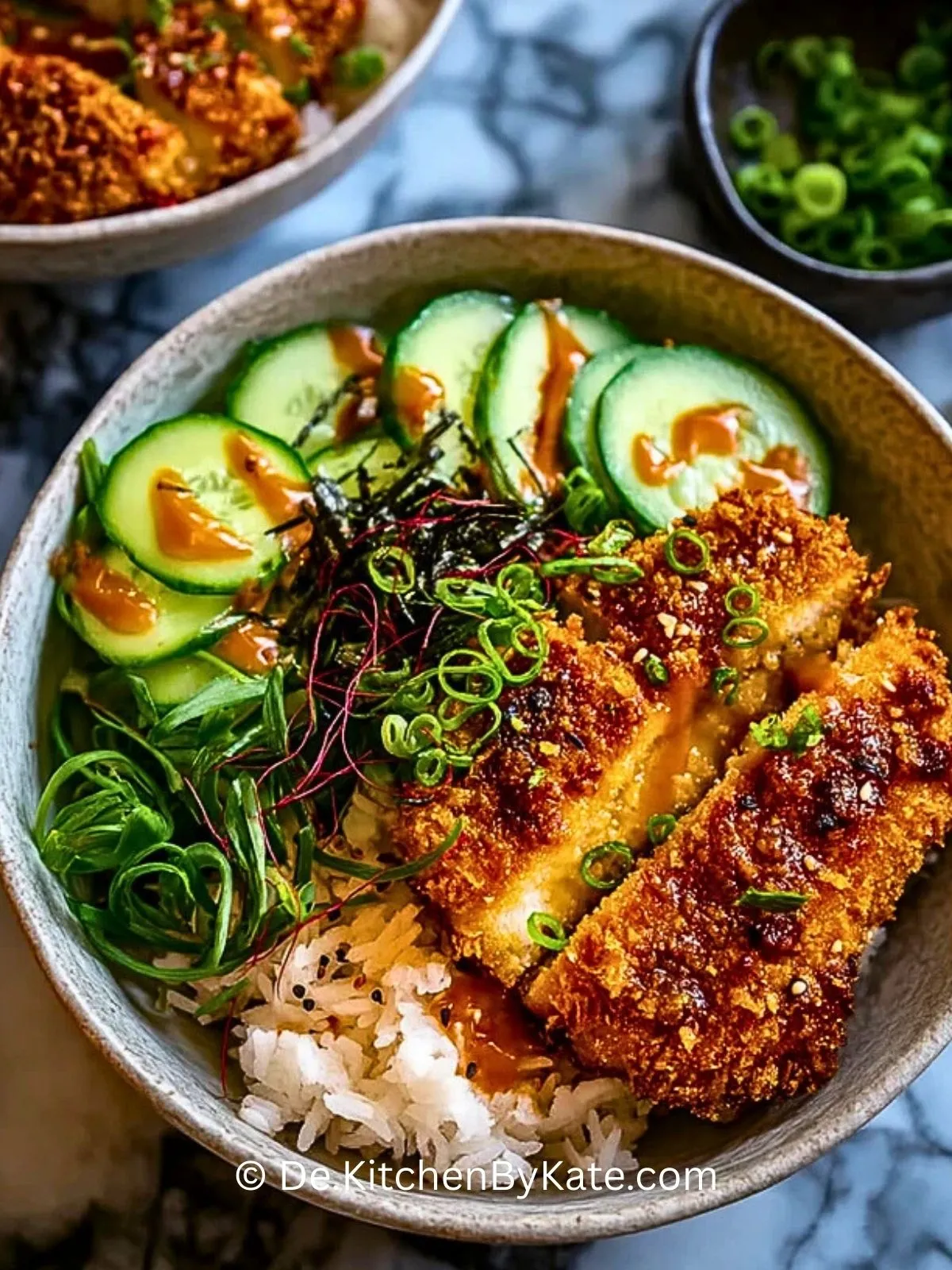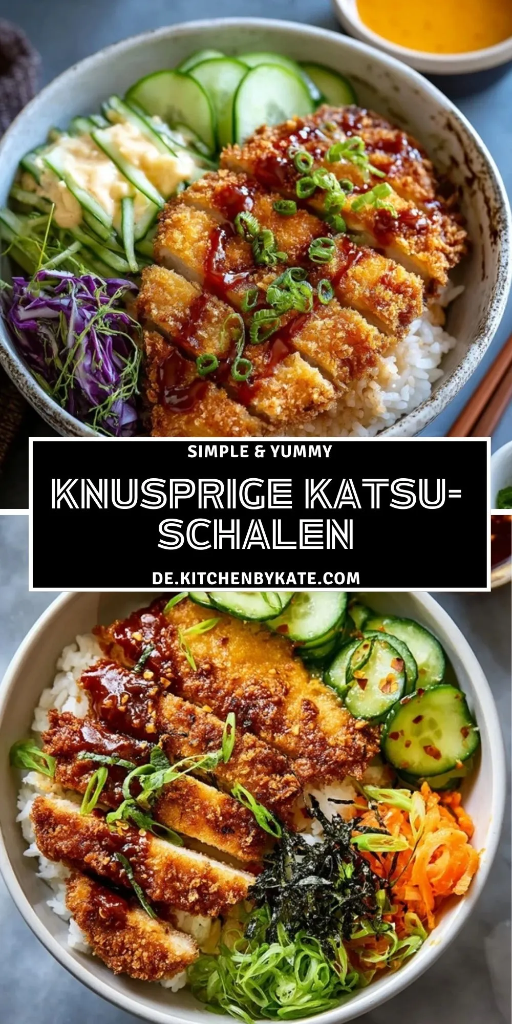 Ein Hauch von Japan in deiner Küche! Die knusprigen Katsu-Schalen kombinieren herzhaftes, goldbraun paniertes Hähnchen (oder Tofu) mit dampfendem Reis und frischem Gemüse – ein perfektes Wohlfühlgericht, das schnell zum neuen Lieblingsessen wird. Die Kontraste aus knuspriger Panade, cremiger Avocado, knackigen Gurken und würziger Sauce machen jede Gabel zu einem echten Genussmoment.