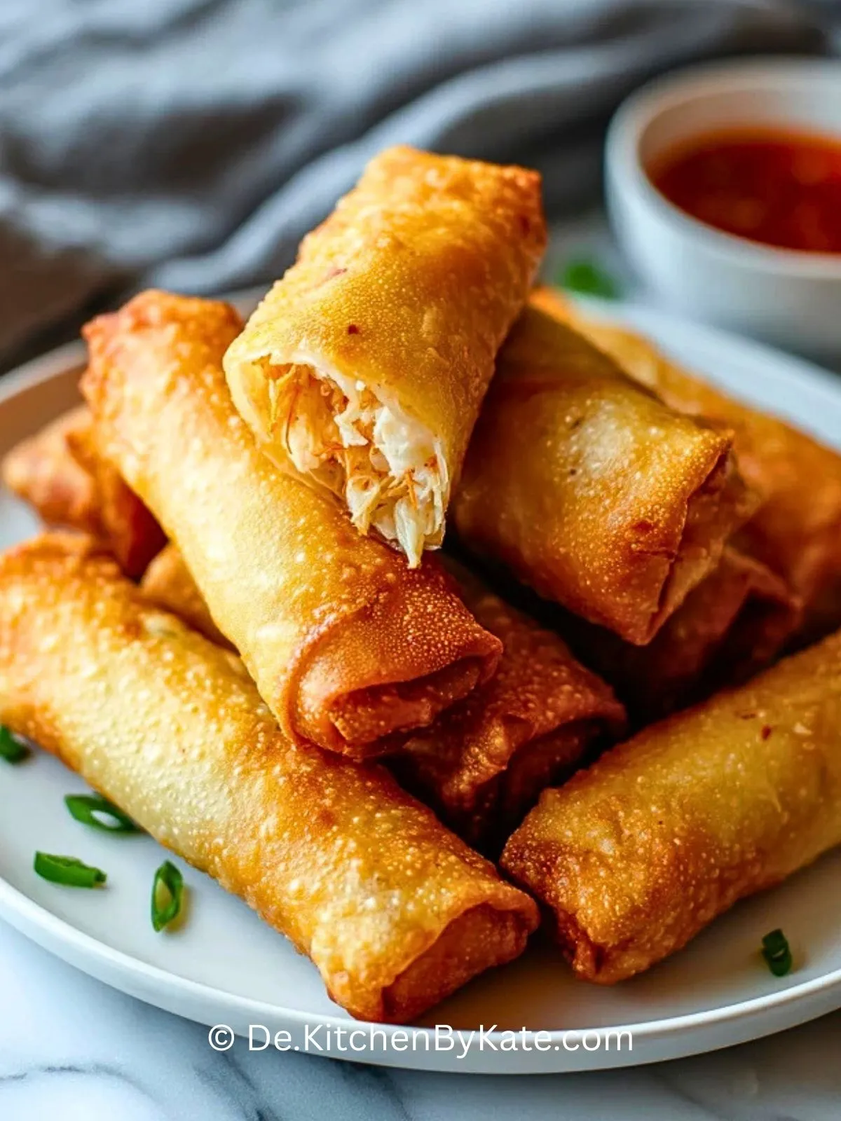 8. Servieren: Frühlingsrollen sofort mit Süß-Chili-Sauce und Frühlingszwiebelringen servieren oder im Ofen bei 100 °C kurz warm halten.