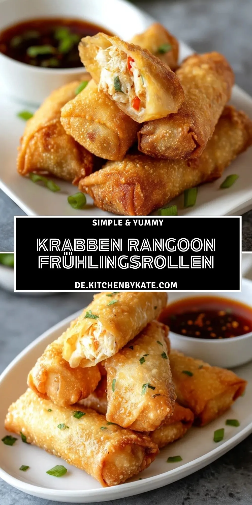 Serviere die Krabben Rangoon Frühlingsrollen am besten direkt heiß und knusprig, zusammen mit einem Schälchen Süß-Chili-Sauce zum Dippen. Ein paar fein geschnittene Frühlingszwiebelringe darüber geben Frische und Farbe.