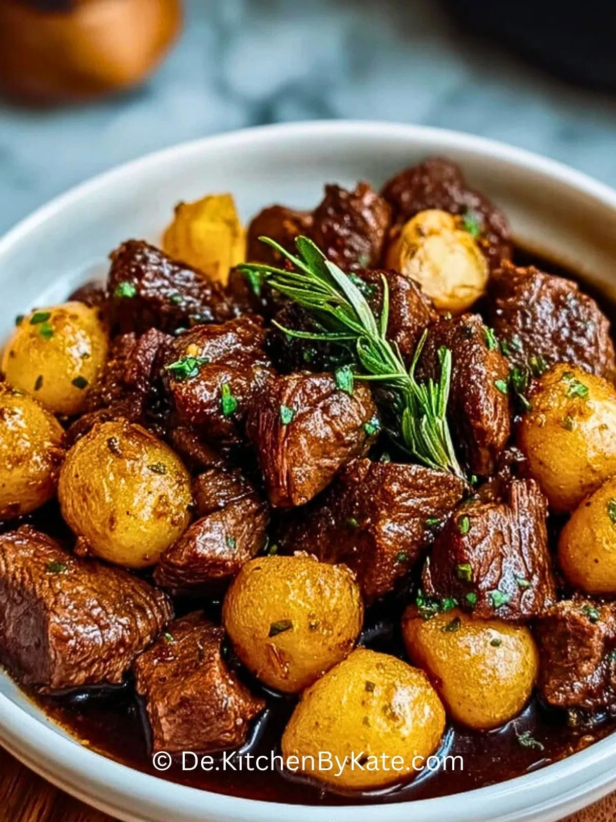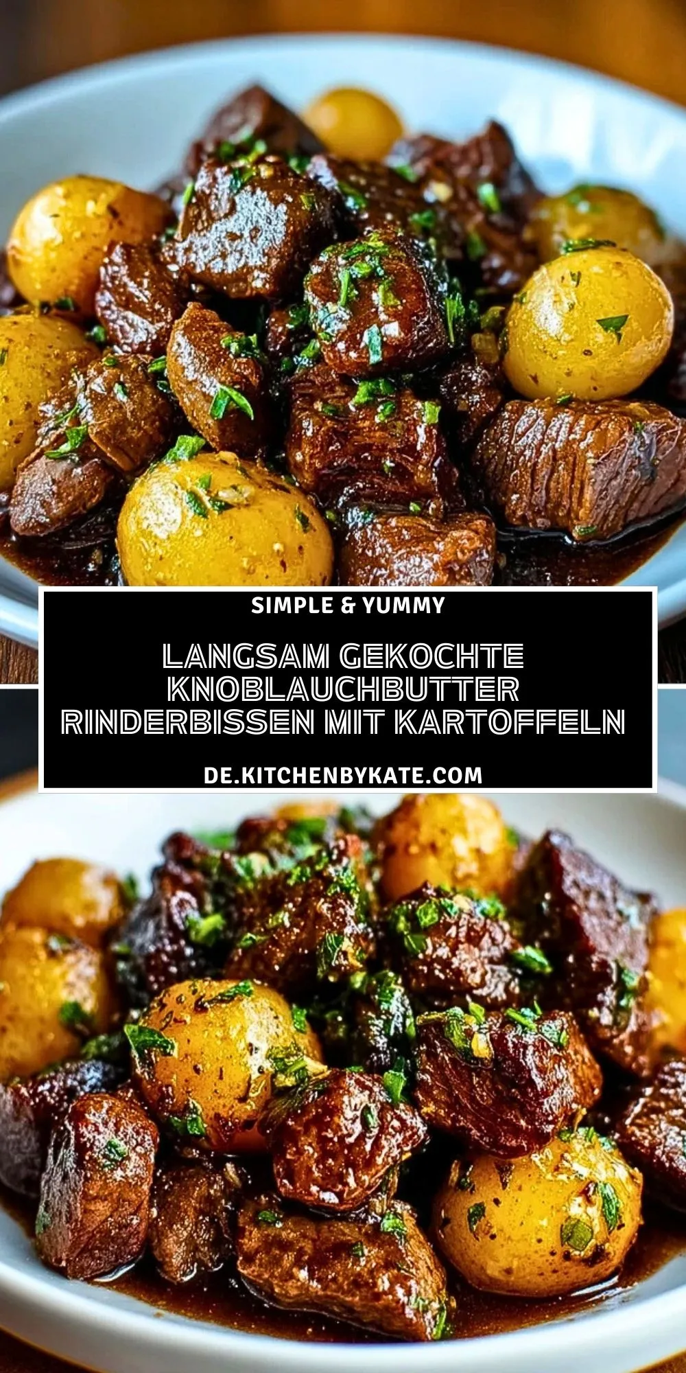 Ein herzhafter Schmortraum für kalte Tage: Zarte Rinderstücke, langsam in einer aromatischen Knoblauchbutter geschmort, treffen auf cremige kleine Kartoffeln und süße Möhren. Diese Kombination bringt ein rustikales Gericht auf den Tisch, das sowohl nach traditioneller Hausmannskost schmeckt als auch mit seinem feinen Knoblauch- und Butternoten begeistert.