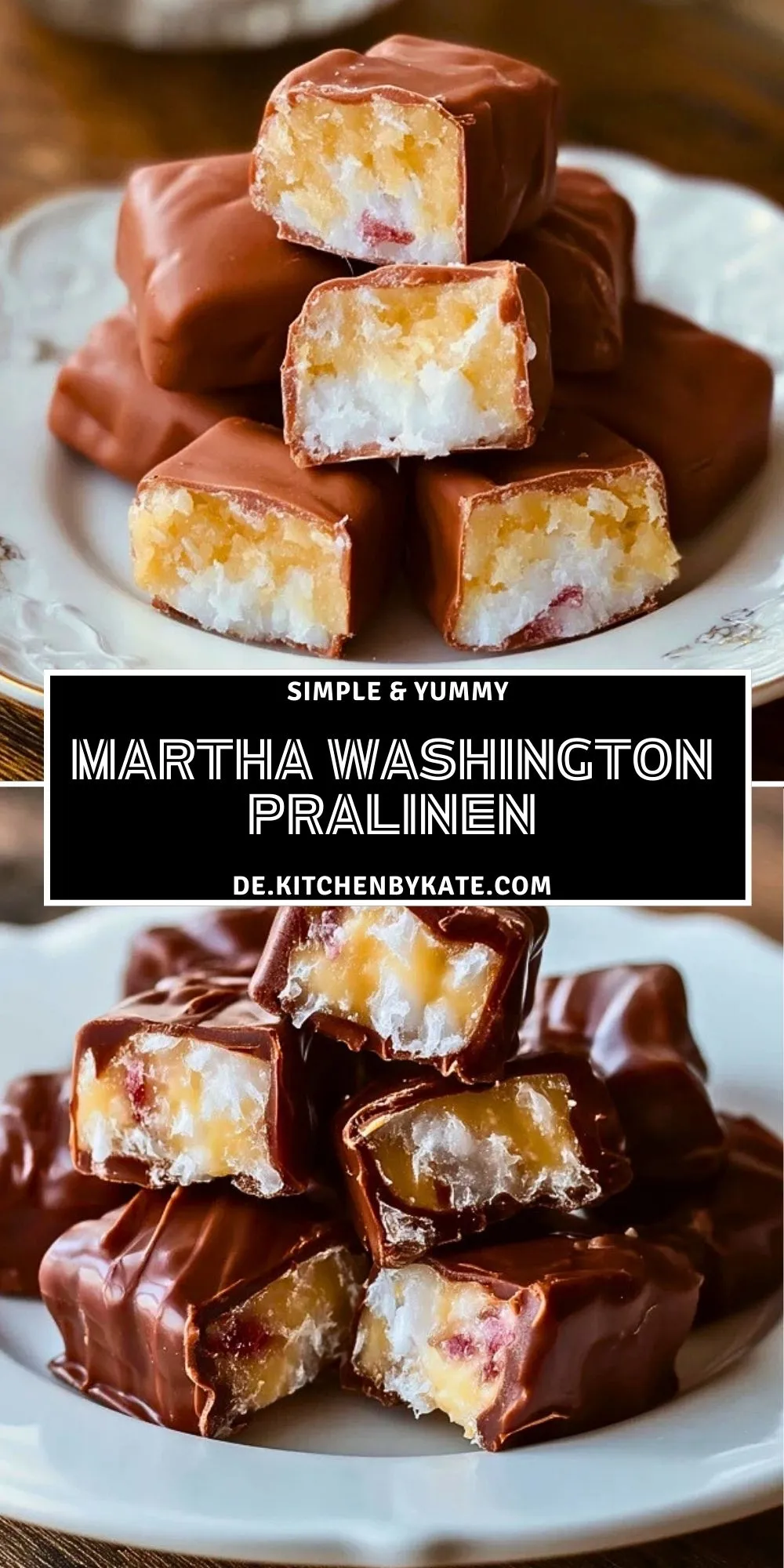 Martha Washington Pralinen sind ein klassisches amerikanisches Konfekt, das traditionell zur Weihnachtszeit zubereitet wird. Eine reichhaltige Füllung aus gezuckerter Kondensmilch, Kokosraspeln, Nüssen und Kirschen wird zu Kugeln oder Würfeln geformt, gut durchgekühlt und anschließend vollständig in geschmolzene Schokolade getaucht. So entstehen kleine, üppige Happen, die sich perfekt verschenken oder auf dem Plätzchenteller servieren lassen.