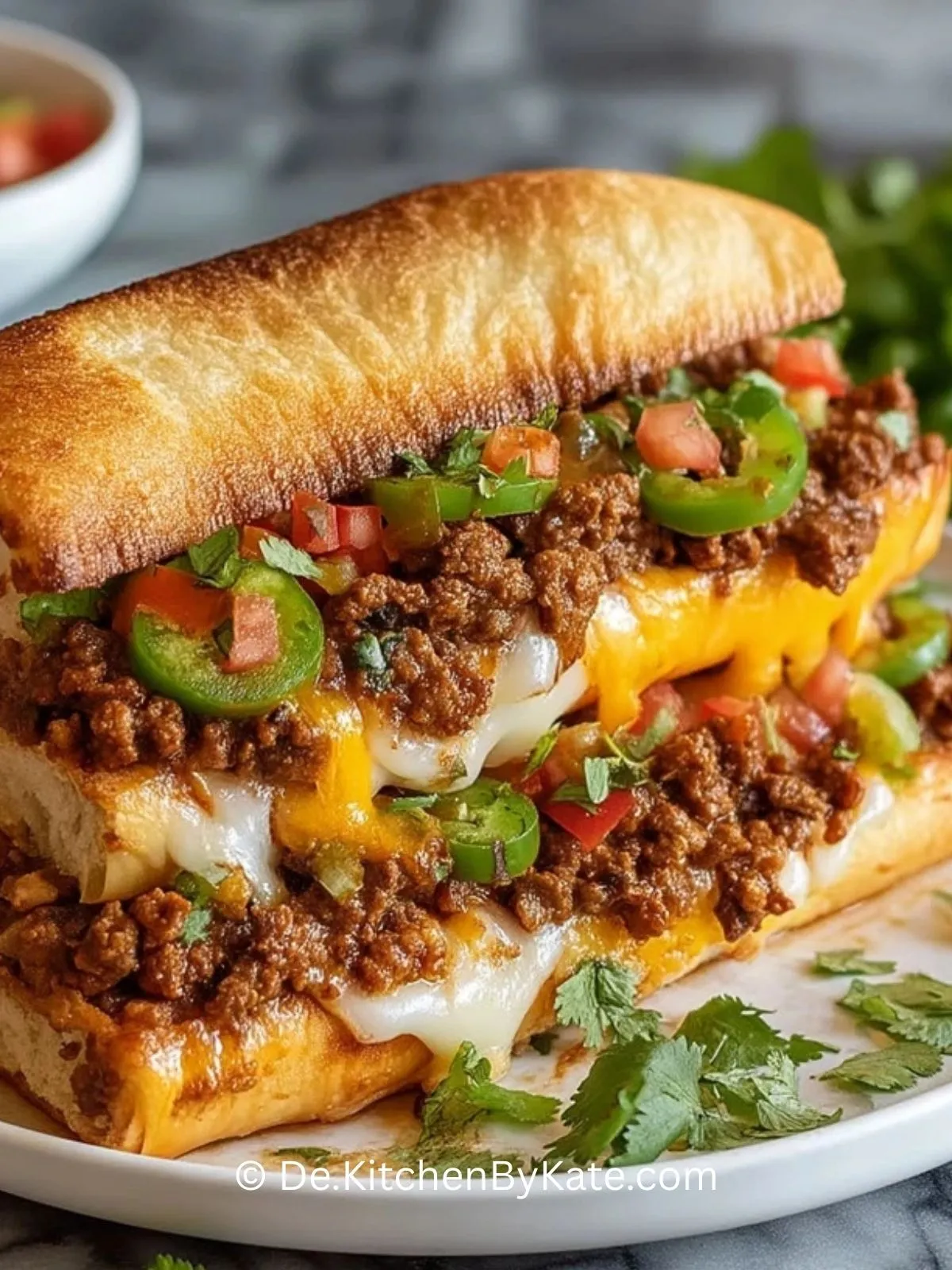 Dieses mexikanische Käse-Sandwich kombiniert würziges Rinderhackfleisch, geschmolzenen Käse und frische Salsa in einem knusprig gerösteten Brötchen – perfekt für ein schnelles Abendessen, das sich wie Streetfood anfühlt. Mit wenig Aufwand bringst du damit Farbe, Schärfe und ordentlich Käse auf den Tisch.