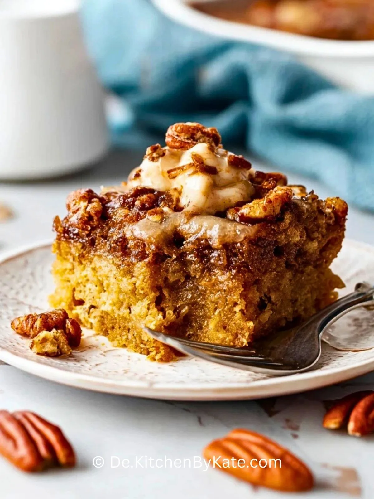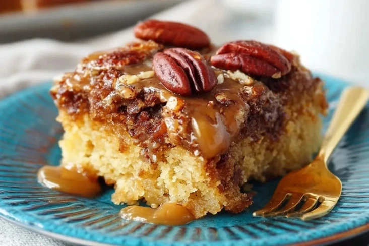 Der Teig ist weich, buttrig und leicht vanillig, darüber kommt eine Schicht aus Pekannüssen, die im Ofen zusammen mit einer sahnigen Karamellsauce karamellisieren. So entsteht ein Dessert, das gleichzeitig fluffig, knusprig und wunderbar klebrig ist – genau das Richtige für alle, die warme, nussige Desserts lieben.