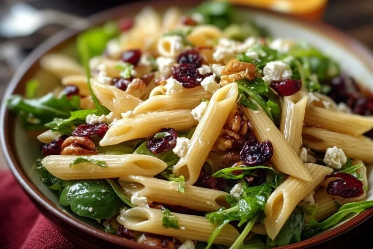 Gesunder Penne-Salat mit Feta, Cranberries und Orangen-Vinaigrette