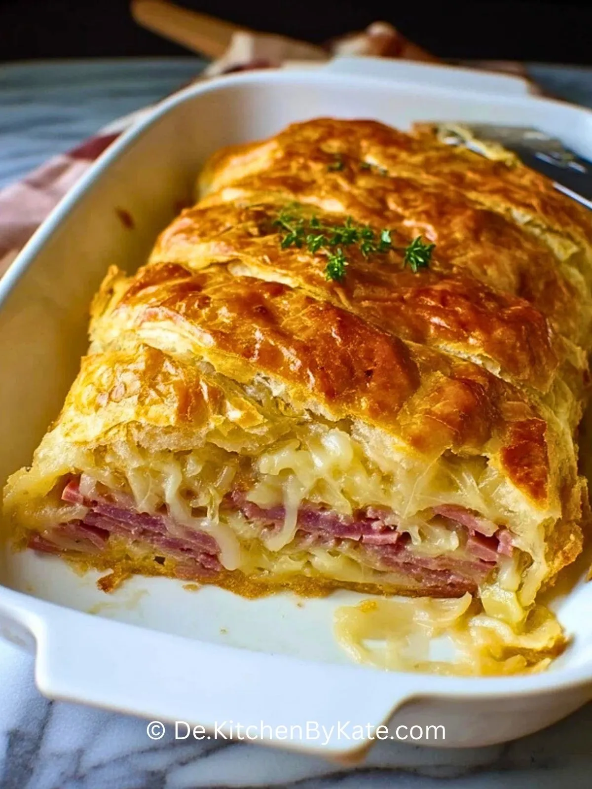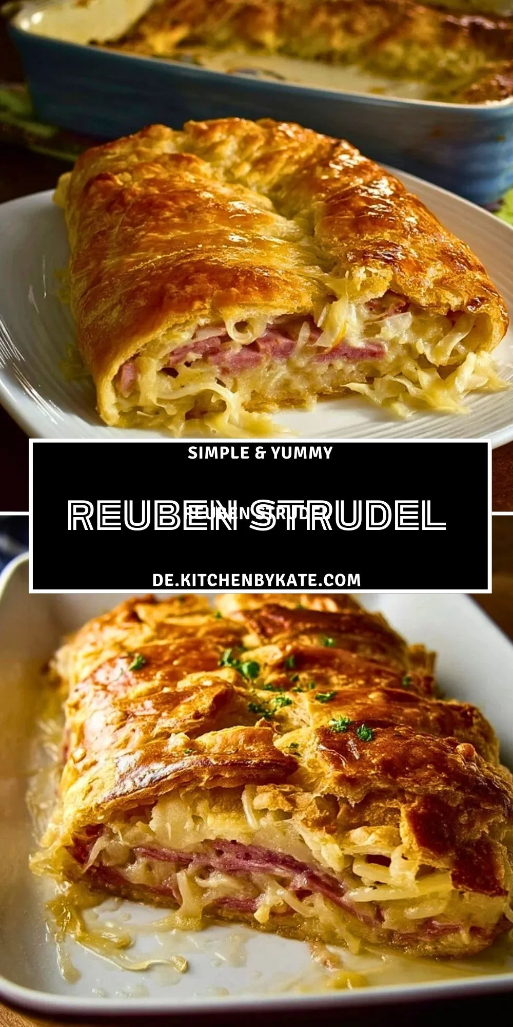 Reuben-Strudel ist eine herzhafte Variante des klassischen amerikanischen Reuben-Sandwichs, bei der würziges Pastrami, cremiges Sauerkraut, schmelzender Käse und russisches Dressing in knusprigen Blätterteig gehüllt werden. Ideal für Brunch, Partybuffet oder ein deftiges Abendessen.