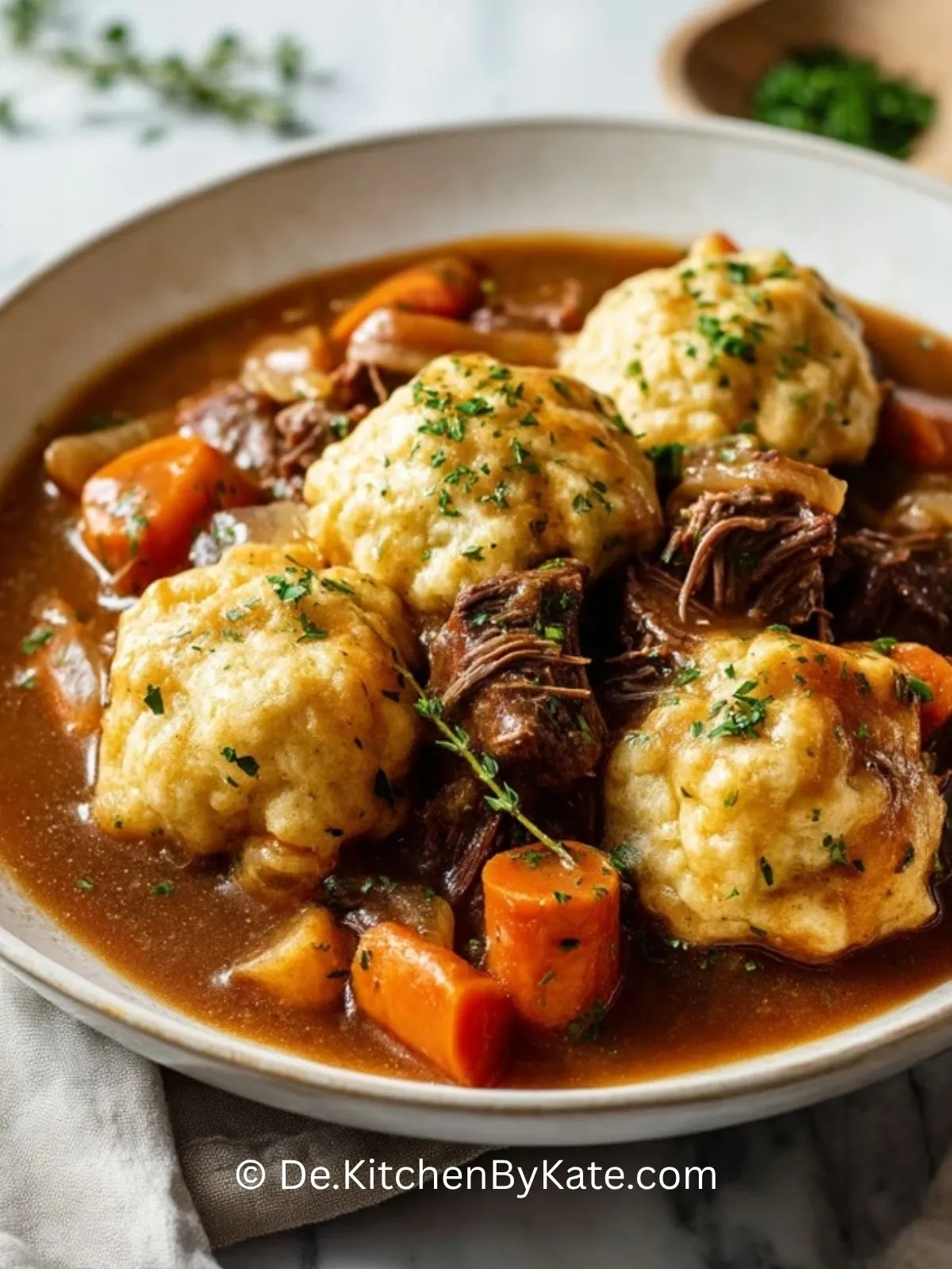 9. Das Rindergulasch zusammen mit den Knödeln servieren und nach Wunsch mit Petersilie bestreuen.
