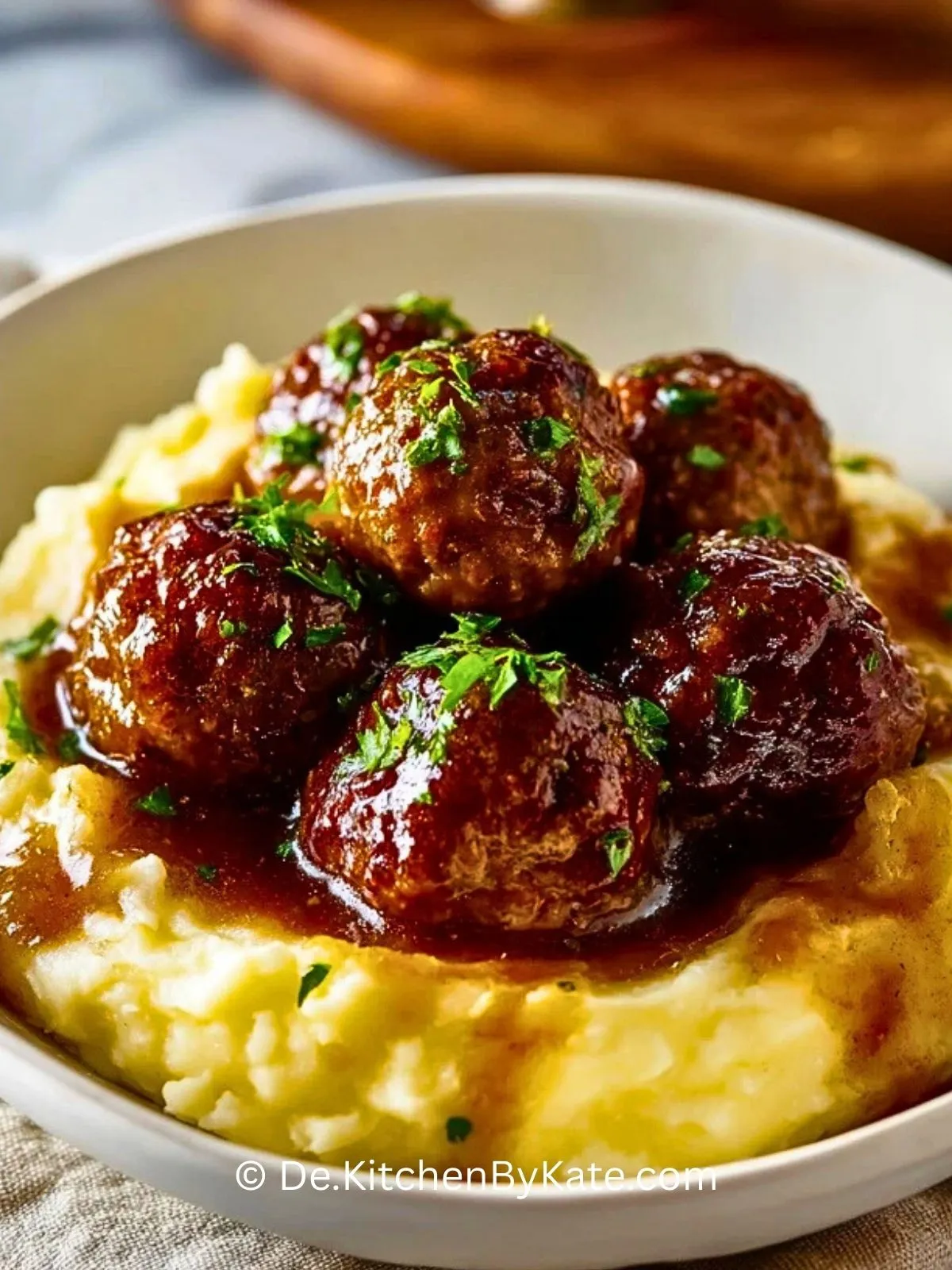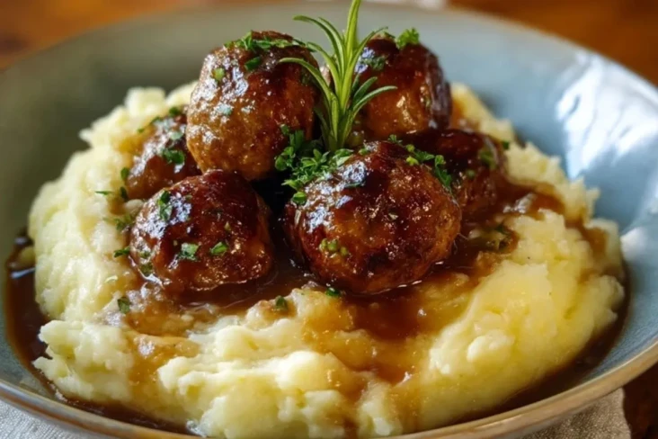 Herzhafte Salisbury Steak Fleischbällchen auf einem cremigen Knoblauch-Kräuter-Püree sind der Inbegriff von wohltuender Hausmannskost. Die würzigen Fleischbällchen, umhüllt von einer aromatischen Soße, treffen auf samtiges Kartoffelpüree mit frischer Kräuternote – ein Klassiker, der nach Zuhause schmeckt.