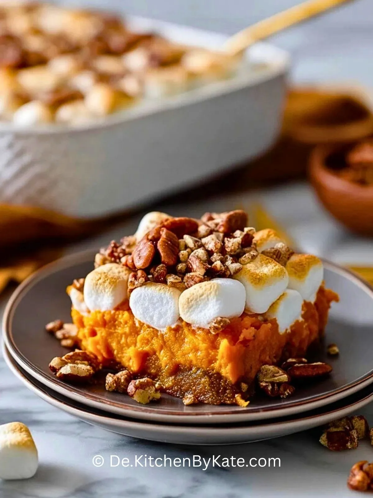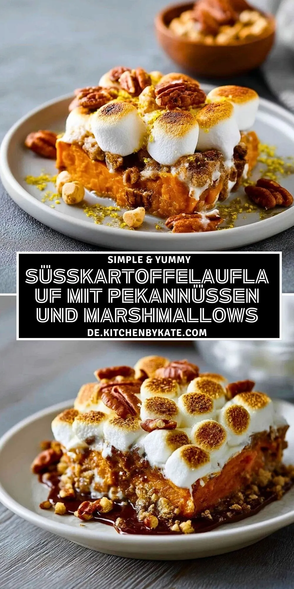 Cremiger Süßkartoffelauflauf trifft auf knusprige Pekannuss-Streusel und goldbraun geröstete Marshmallows. Das perfekte Festtagsgericht – süß, herzhaft und unwiderstehlich!