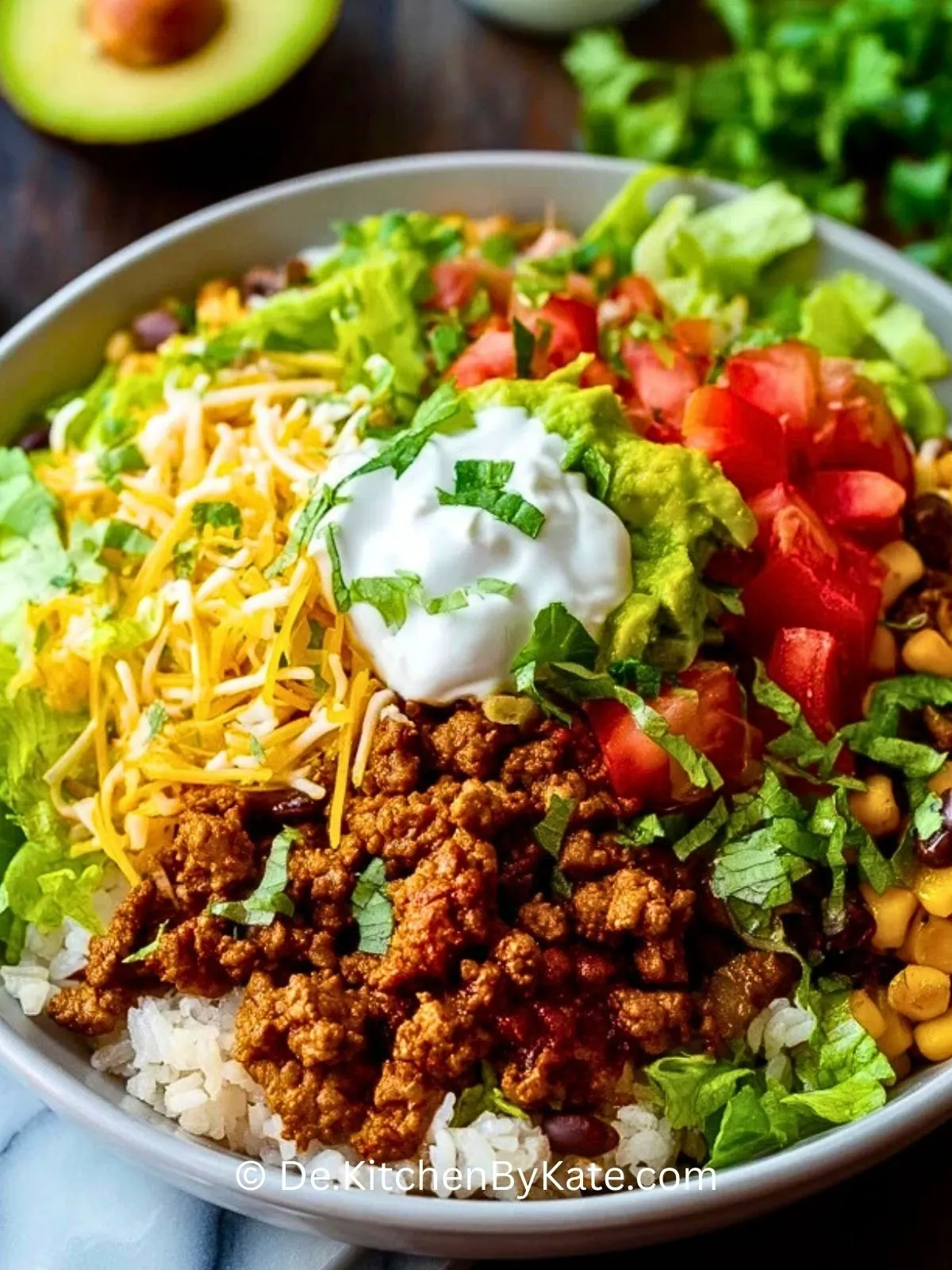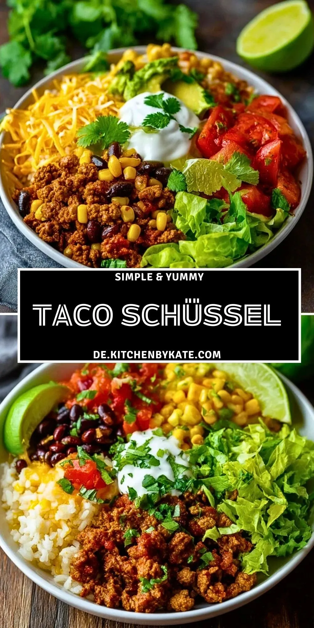 Diese Taco Schüssel vereint alles, was wir an mexikanischem Essen lieben: würziges Hackfleisch, saftige Tomaten, knackigen Salat, Mais, Bohnen und cremige Guacamole – schnell gemacht und voller Aromen!