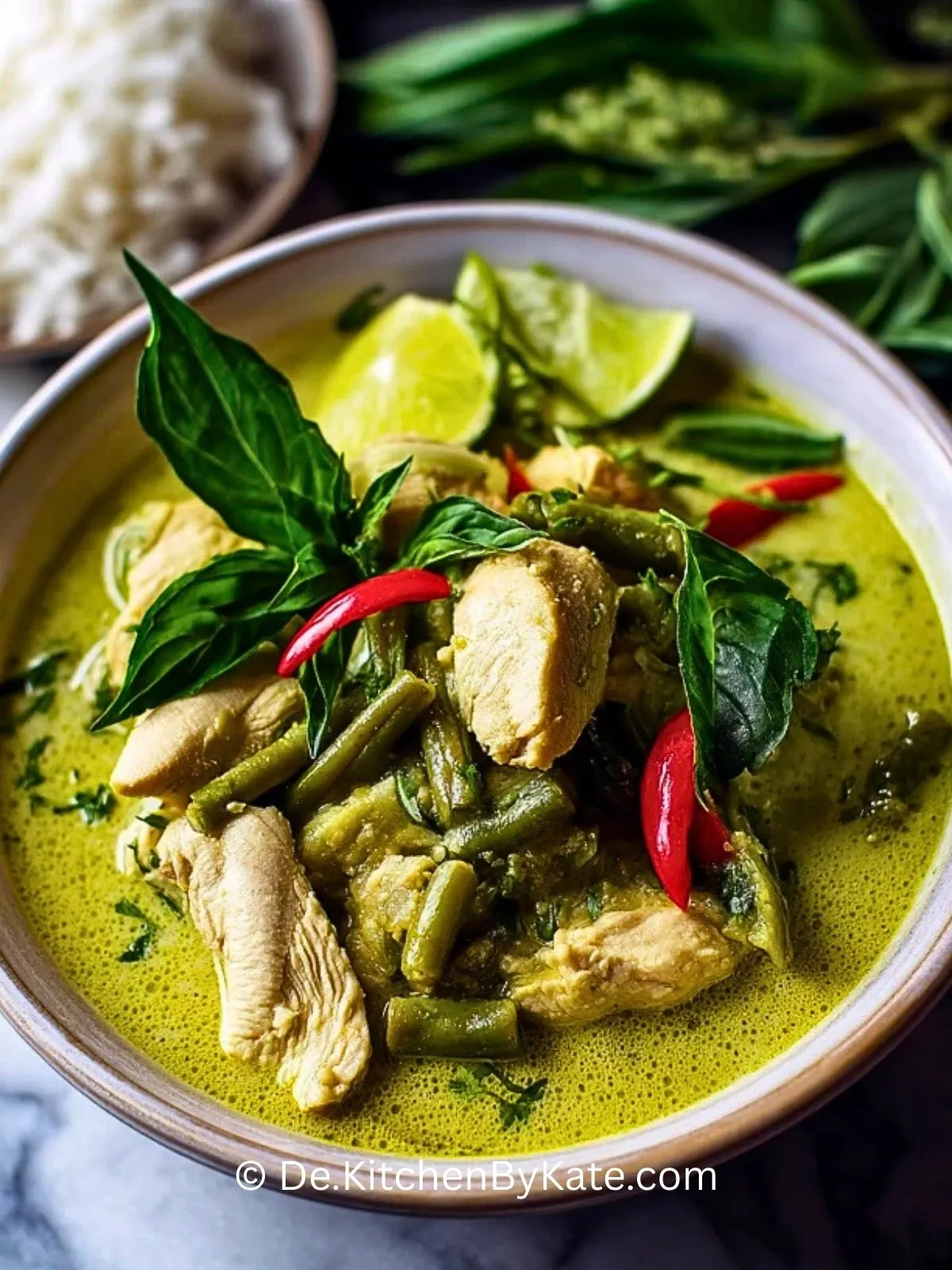 Ein cremiges, aromatisches Thailändisches Grünes Curry mit Hühnchen, frischem Gemüse und Kokosmilch, das in kurzer Zeit zubereitet ist und mit Jasminreis serviert für echtes Thailand-Feeling zu Hause sorgt.