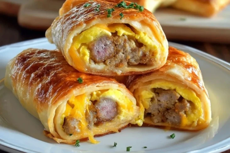 Knuspriger Blätterteig, herzhafte Bratwurst, cremiges Rührei und geschmolzener Käse vereinen sich in diesen Frühstücks-Röllchen zu einem perfekten Start in den Tag. Sie sind einfach vorbereitet, gelingsicher und schmecken frisch ebenso wie aufgewärmt.