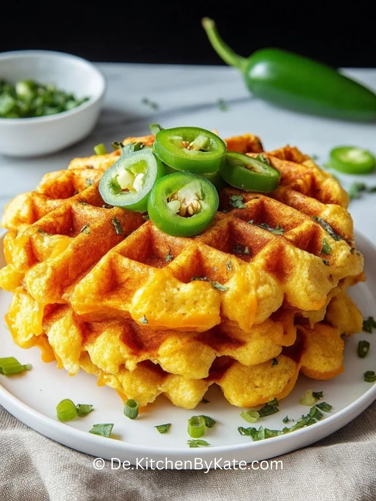 Herzhafte Maiswaffeln mit würzigem Cheddar, süßen Maiskörnern und frischen Jalapeños. Sie werden außen goldbraun und leicht knusprig, bleiben innen saftig und passen perfekt zu Brunch, Abendessen oder als pikanten Snack mit Dip.