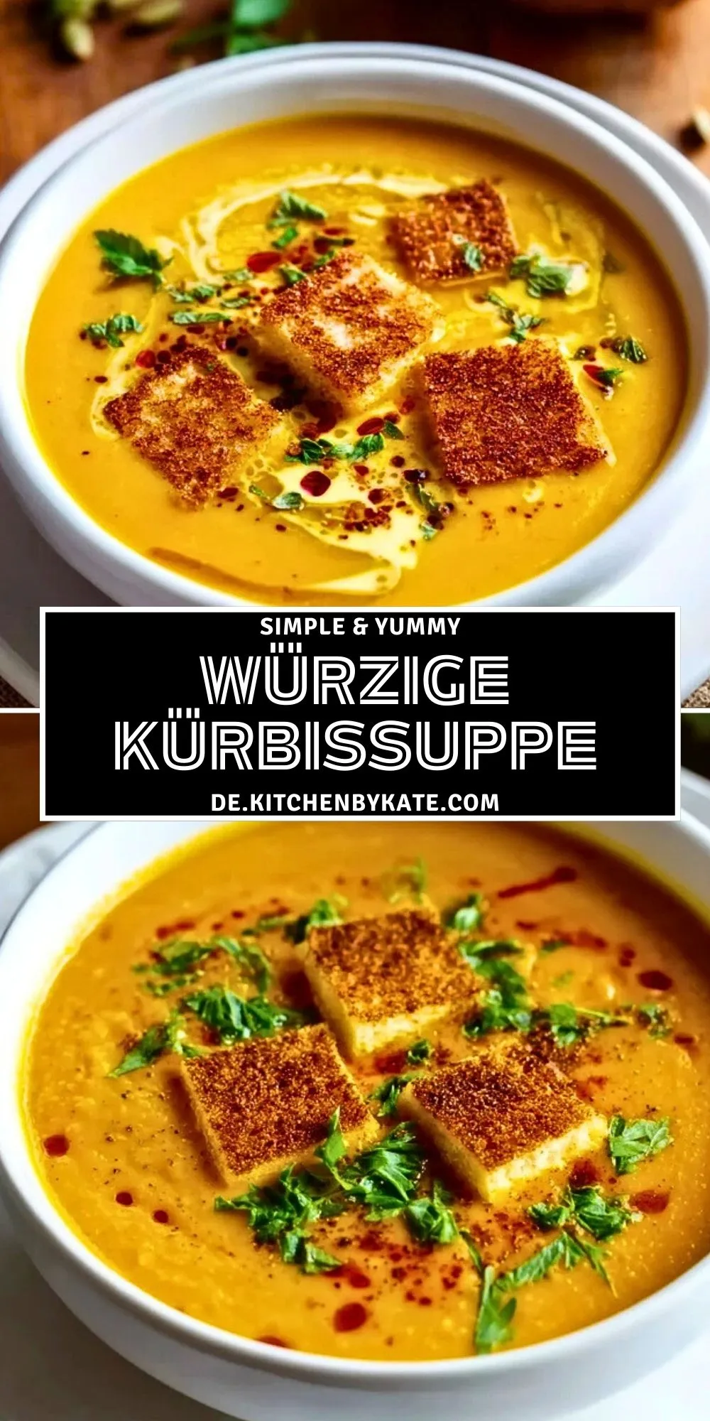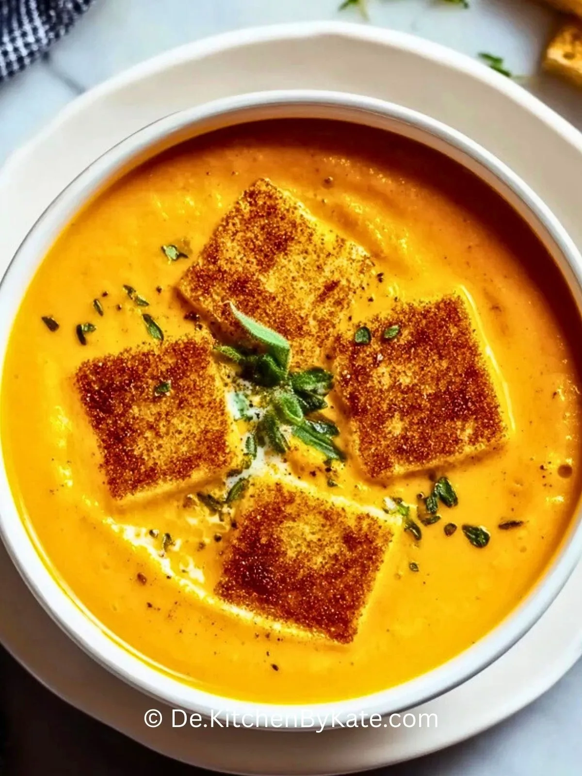 Die goldene Farbe und der angenehme Duft machen diese Suppe nicht nur zu einem Gaumenschmaus, sondern auch zu einem echten Blickfang auf dem Tisch. Besonders lecker wird sie mit knusprigen Croûtons oder geröstetem Halloumi als Topping, wie auf dem Bild – das sorgt für ein unwiderstehliches Zusammenspiel von cremig und knusprig.